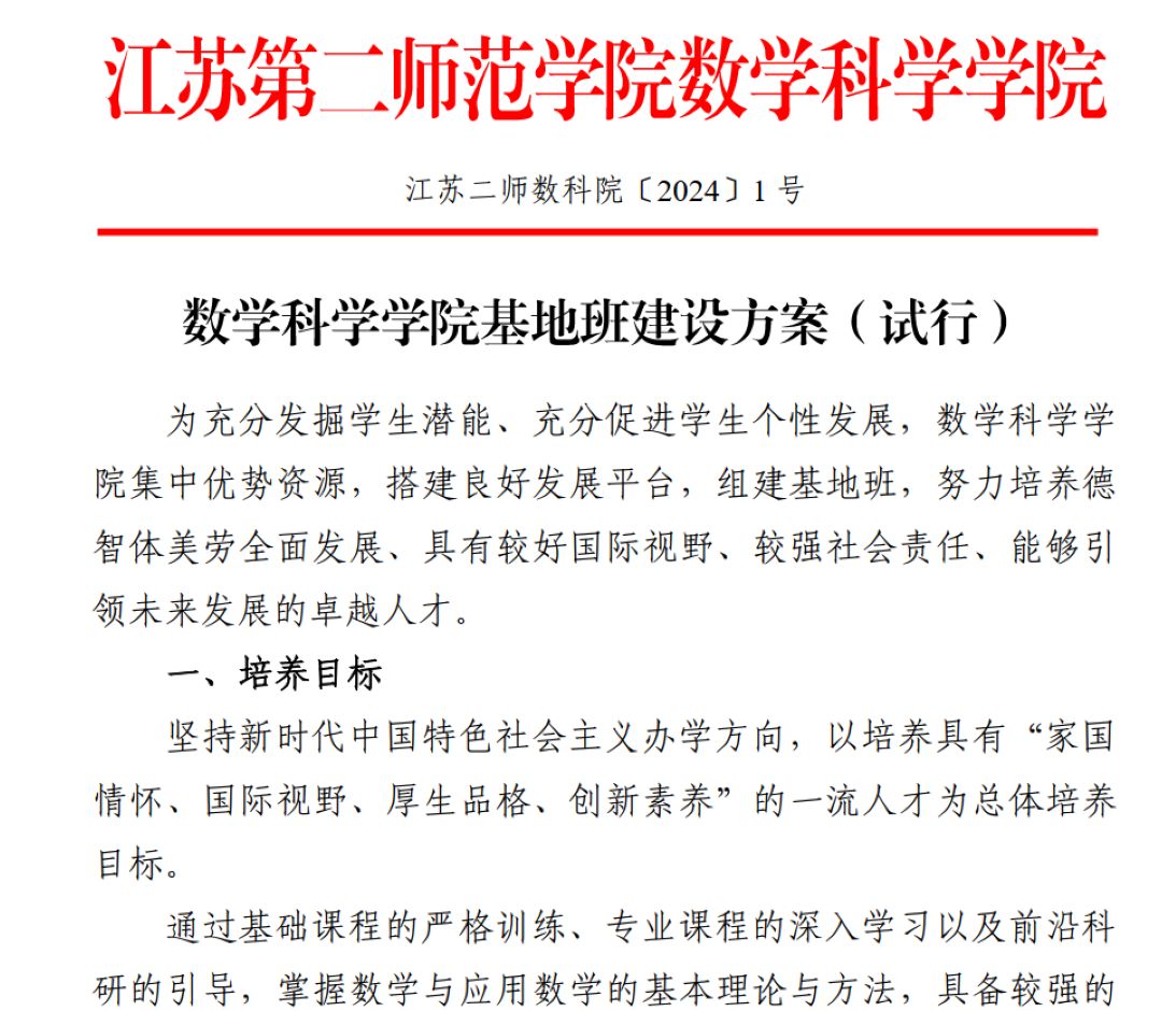 学院在对多所高校进行充分调研的基础上,会同教务处、学工处等部门,制定出台《数学科学学院基地班建设方案(试行)》。