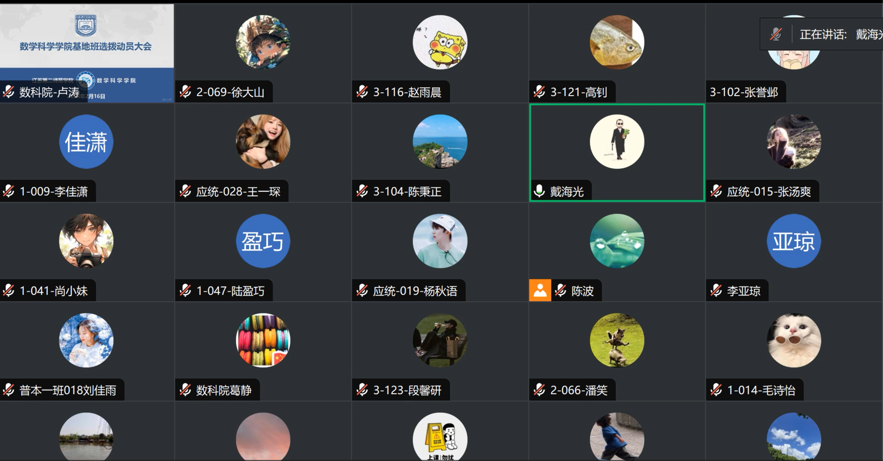 学院面向2023级全体新生和家长,召开基地班选拔动员大会(线上),求真书院党总支书记戴海光、教务处处长仇方道、学院班子成员、全体辅导员参会,会议由葛静主持。
