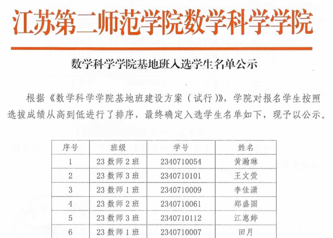 2月19日,在学生报名的基础上,学院根据选拔方案,综合期末专业课成绩、大学英语成绩和高考数学成绩等最终确定30人选拔名单,并予以公示。