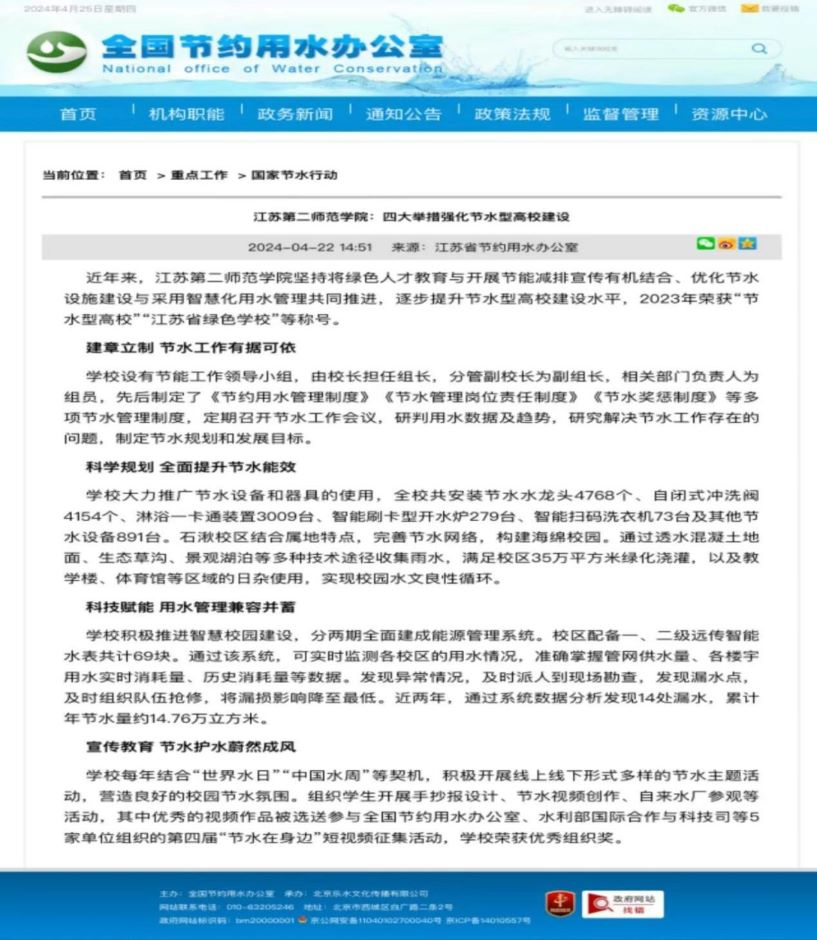 2023年我校荣获“节水型高校”“江苏省绿色学校”等称号。我校对创建过程中的做法和经验进行总结,全国节约用水办公室报道了我校具体做法。