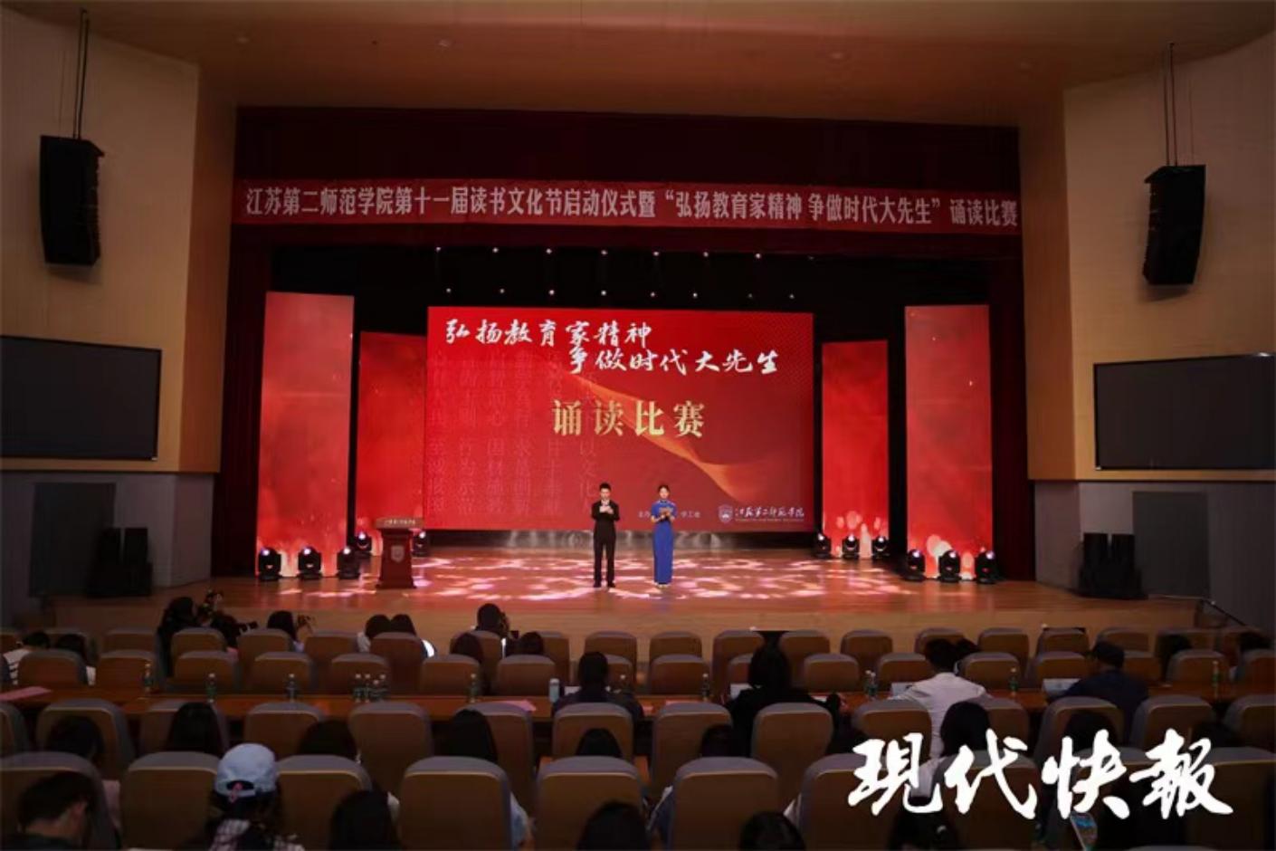 现代快报讯(通讯员 丁莹 谢昕潭 记者 于露)近日,江苏第二师范学院举办第十一届读书文化节启动仪式暨“弘扬教育家精神 争做时代大先生”诵读比赛。本届读书文化节以“奏阅读之乐,筑二师之梦”为主题,将通过阅读启航、走“近”读者、走“进”书籍三个板块展开形式多样的读书活动,时间为期两个月。