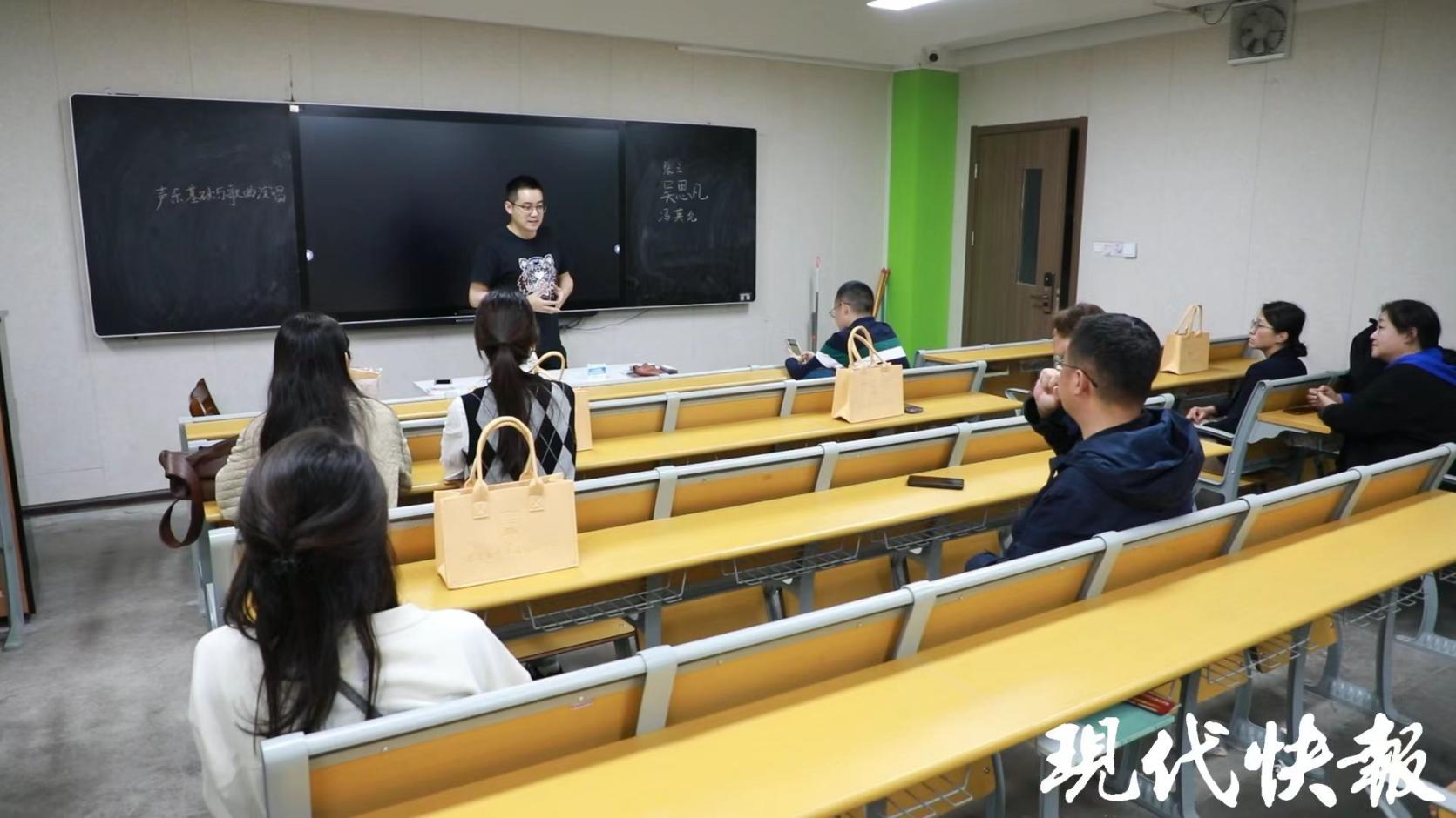 “我像一朵雪花天上来,总想飘进你的情怀……”《声乐基础与歌曲演唱》课堂教室外,传来动听的歌声。课堂上,老师告诉同学们,要体会声乐的乐趣。他还鼓励同学们走上讲台一展歌喉。00后幼儿园老师吴思凡、冯英允结伴报了这门夜校课程,课堂上,她们听得津津有味。2023年两人从江苏第二师范学院学前教育专业毕业,这次又回到了母校的课堂,她们感到很亲切。