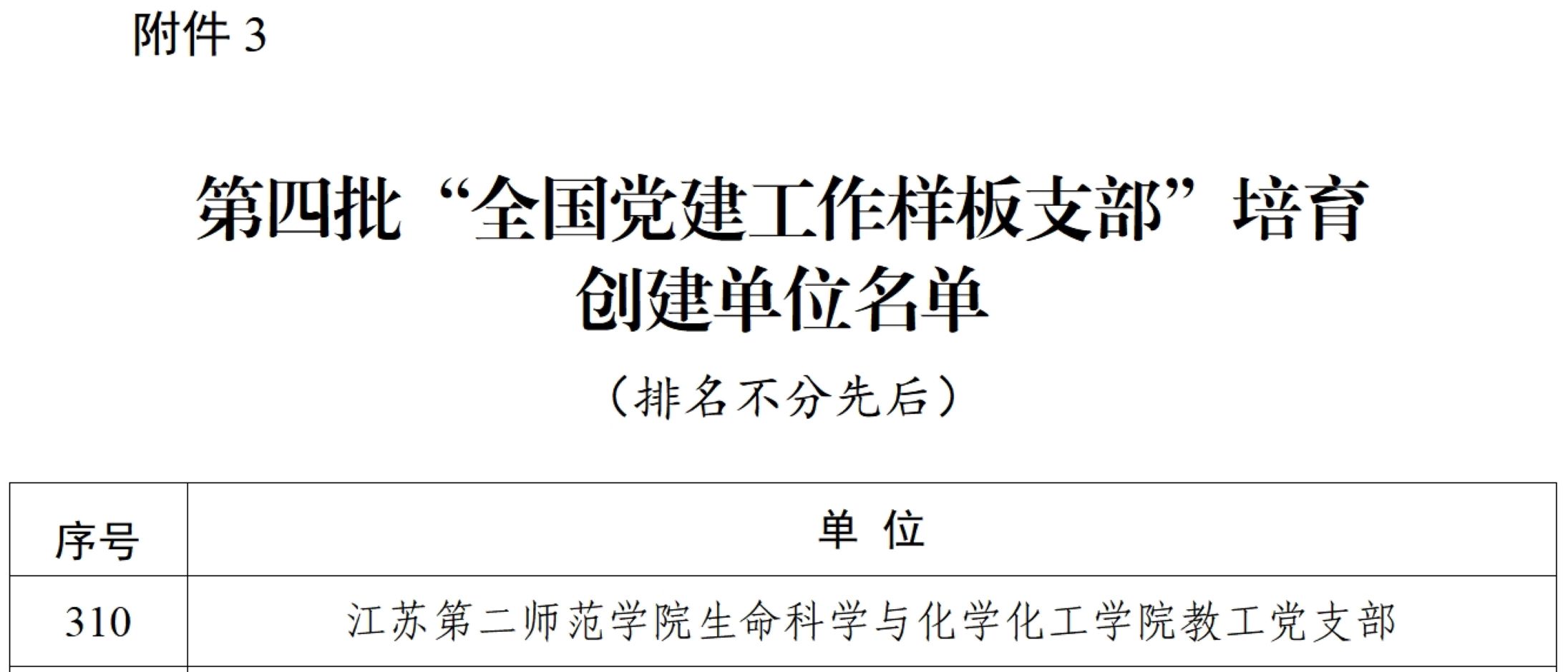 近日,教育部公布了第四批新时代高校党建示范创建和质量创优工作(以下简称党建“双创”工作)培育创建单位名单,我校生化学院教工党支部入选第四批“全国党建工作样板支部”培育创建单位,是继马克思主义学院学生党支部入选第二批“全国党建工作样板支部” 培育创建单位以来的第2个“全国党建工作样板支部” 培育创建单位。