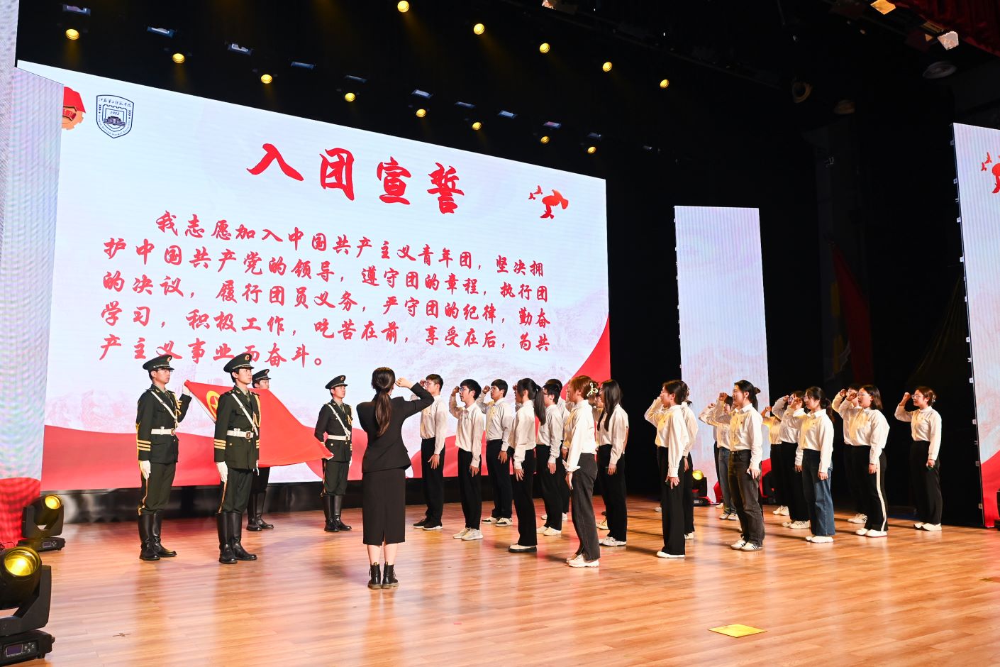 优秀共青团干部教师为新入团学生代表授团徽,重温入团誓词,集体宣誓。大会在入团仪式中落下帷幕。