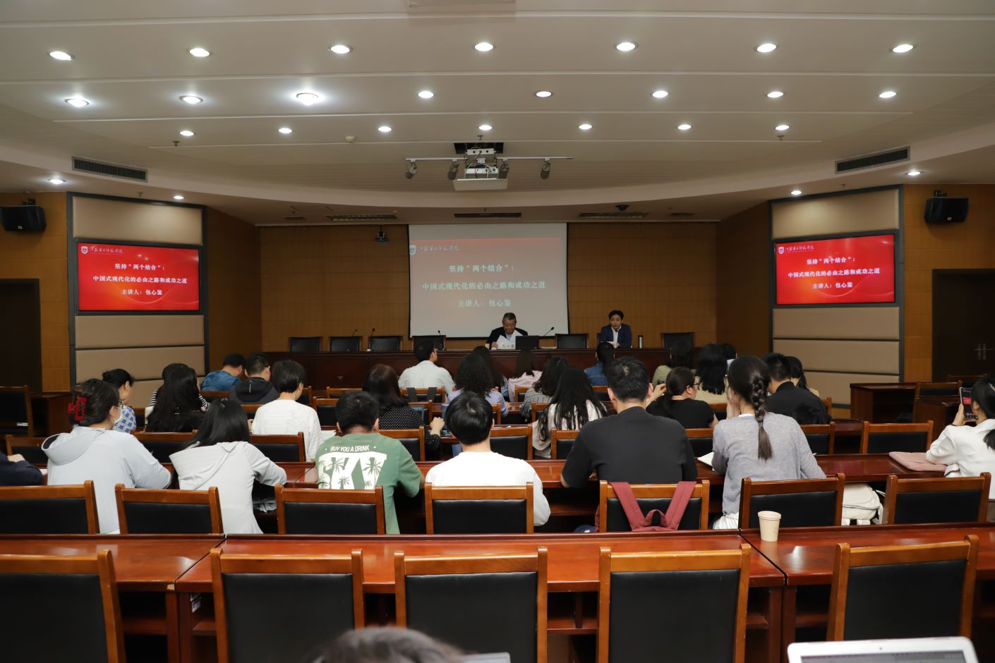 讲座第一部分由包心鉴教授以“坚持‘两个结合’中国式现代化的必由之路和成功之道”为主题,从四个方面展开探讨:第一,如何正确把握“两个结合”的重大意义及相互关系?包心鉴教授强调“两个结合”是党历史经验的深刻总结,是探索中国特色社会主义道路的规律性认识,是发展中国特色社会主义的必由之路,是中国共产党取得成功的最大法宝。第二,“两个结合”的实质是对中国式现代化道路的不懈探索和正确选择。通过回顾中华民族近代以来的历史,指明探索中国式现代化道路的逻辑起点,强调中国共产党的百年历史就是探索中国式现代化道路的历史,习近平“两个结合”的重要思想是在领导中国式现代化探索过程当中进一步深化了对“两个结合”的认识。第三,中国式现代化过程中如何坚持第一个结合?重要任务是坚定现代化的人民性方向,构建中国式现代化的人民主体性。第四,中国式现代化过程中如何理解第二个结合?首先要巩固中国式现代化的文明根脉。中华优秀传统文化的博大精华主要体现在六个方面:一是人文至上精神,二是立德修身品质,三是家国一体情怀,四是维新变革思想,五是中和为美境界,六是崇尚整体思维。此外,包心鉴教授还强调在理解“两个结合”的关系,创造中华民族现代文明的过程中要澄清三大模糊认识,一是不能简单将传统文化与马克思主义等同起来,二是不能通过抬高传统文化贬低马克思主义的根本指导作用,三是不能以第二个结合取代第一个结合。