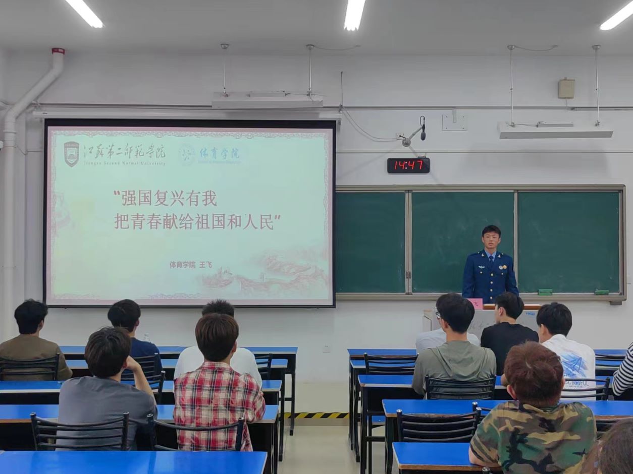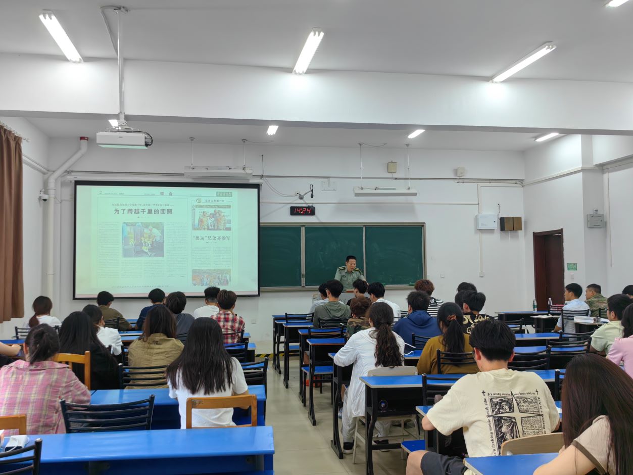 王飞以“强国复兴有我,把青春献给祖国和人民”为题,与同学们分享了他的军旅生活和心路历程。他从当兵的初衷,参军的意义以及为实现报国理想而做出的努力与收获等几个方面展开:“参军入伍不仅仅是为国防事业做贡献,更是一次自我提升的机会,军旅生活会让我变得更加坚韧、自信和独立。部队教会了我如何应对挑战、如何管理时间、如何与人合作,这些能力在我的学业和生活中都发挥了重要作用。”