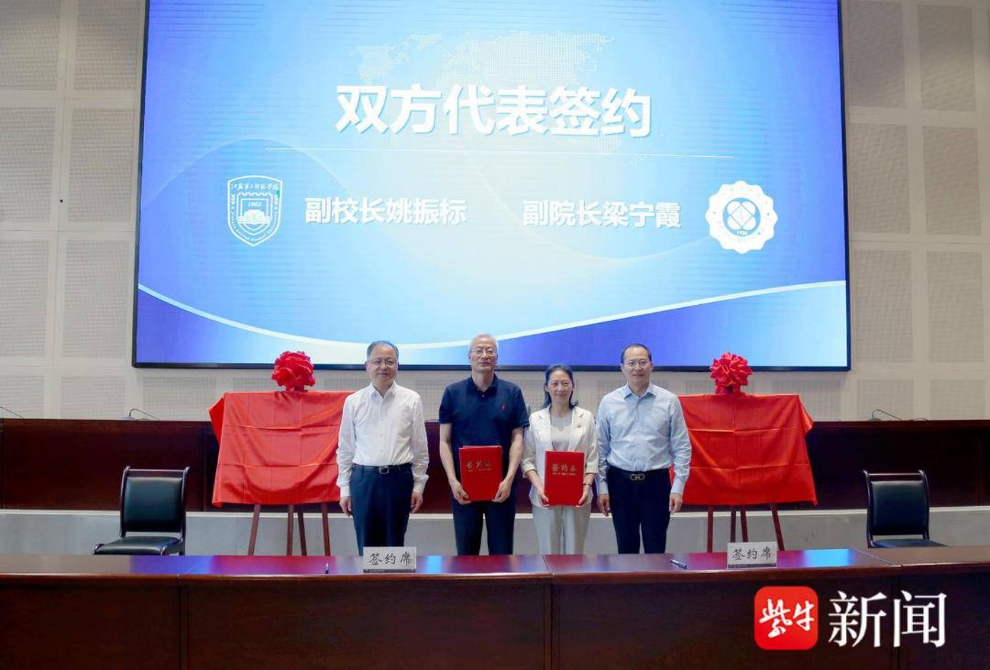 江苏二师副校长姚振标、省人医副院长梁宁霞代表双方签署了战略合作协议。双方职能部门负责人共同为“学生实习实训基地”“创新型一站式学生社区”揭牌。
