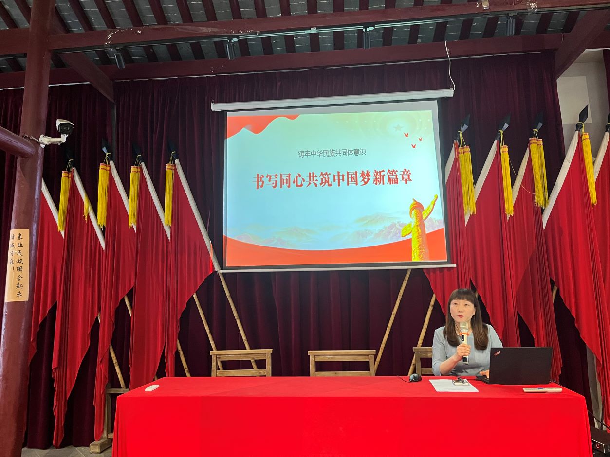 在铸牢中华民族共同体教育环节,陈蓓做“铸牢中华民族共同体意识,书写同心共筑中国梦新篇章”主题讲座。她分别从百年来中华民族共同体意识演进历程、铸牢中华民族共同体意识的时代之需等方面进行细致讲解。