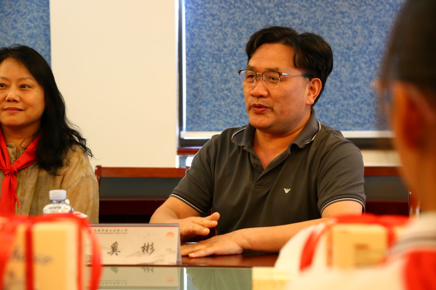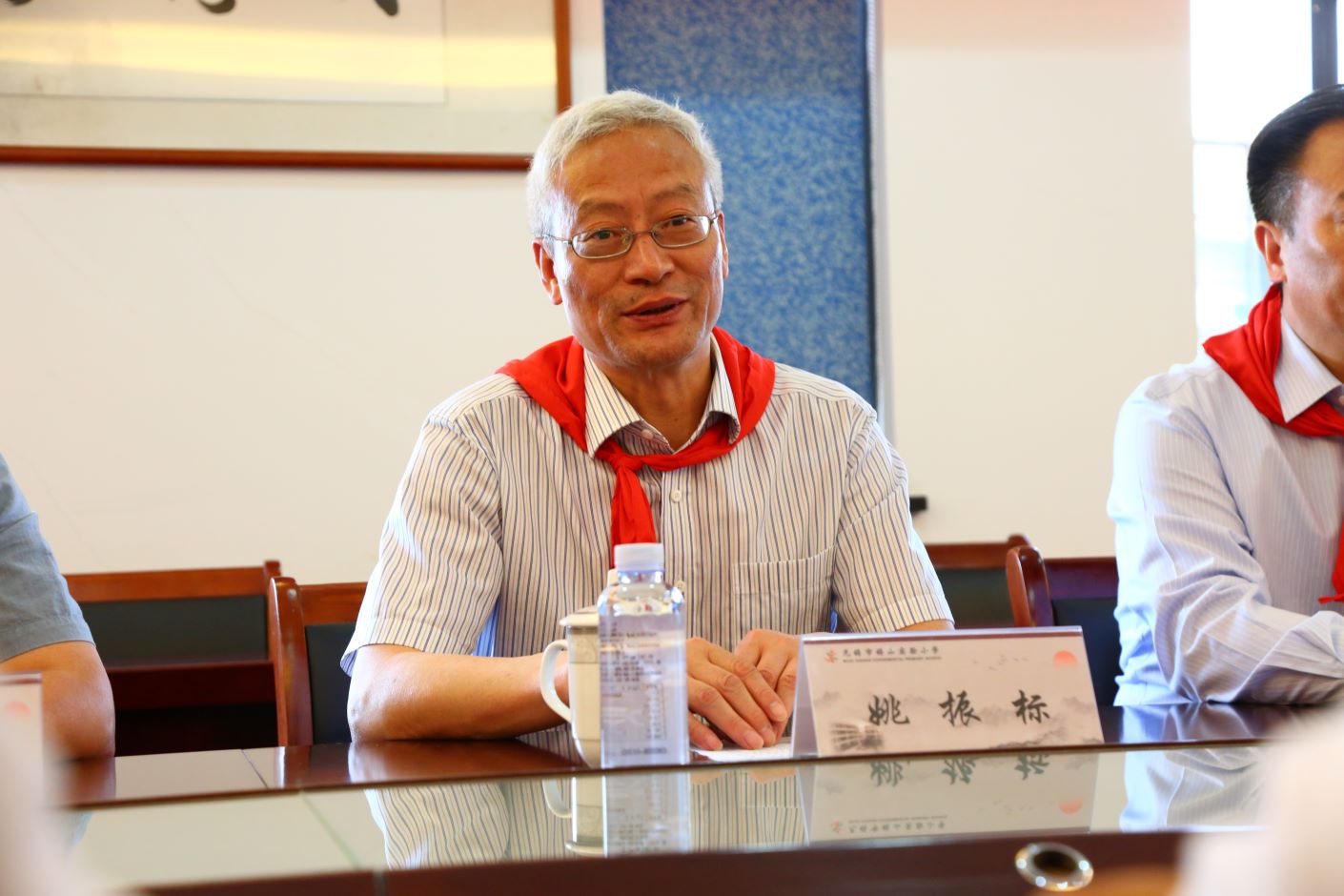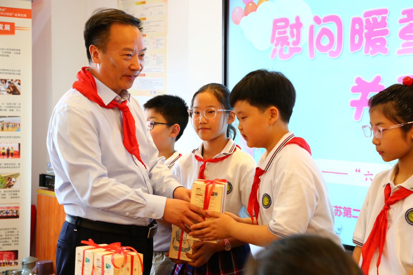 捐赠仪式上,少先队员们为捐赠的领导和嘉宾佩戴了鲜艳的红领巾,校领导姚振标、皇甫立同分别向锡山实小的师生代表捐赠了图书、水杯及慰问金。