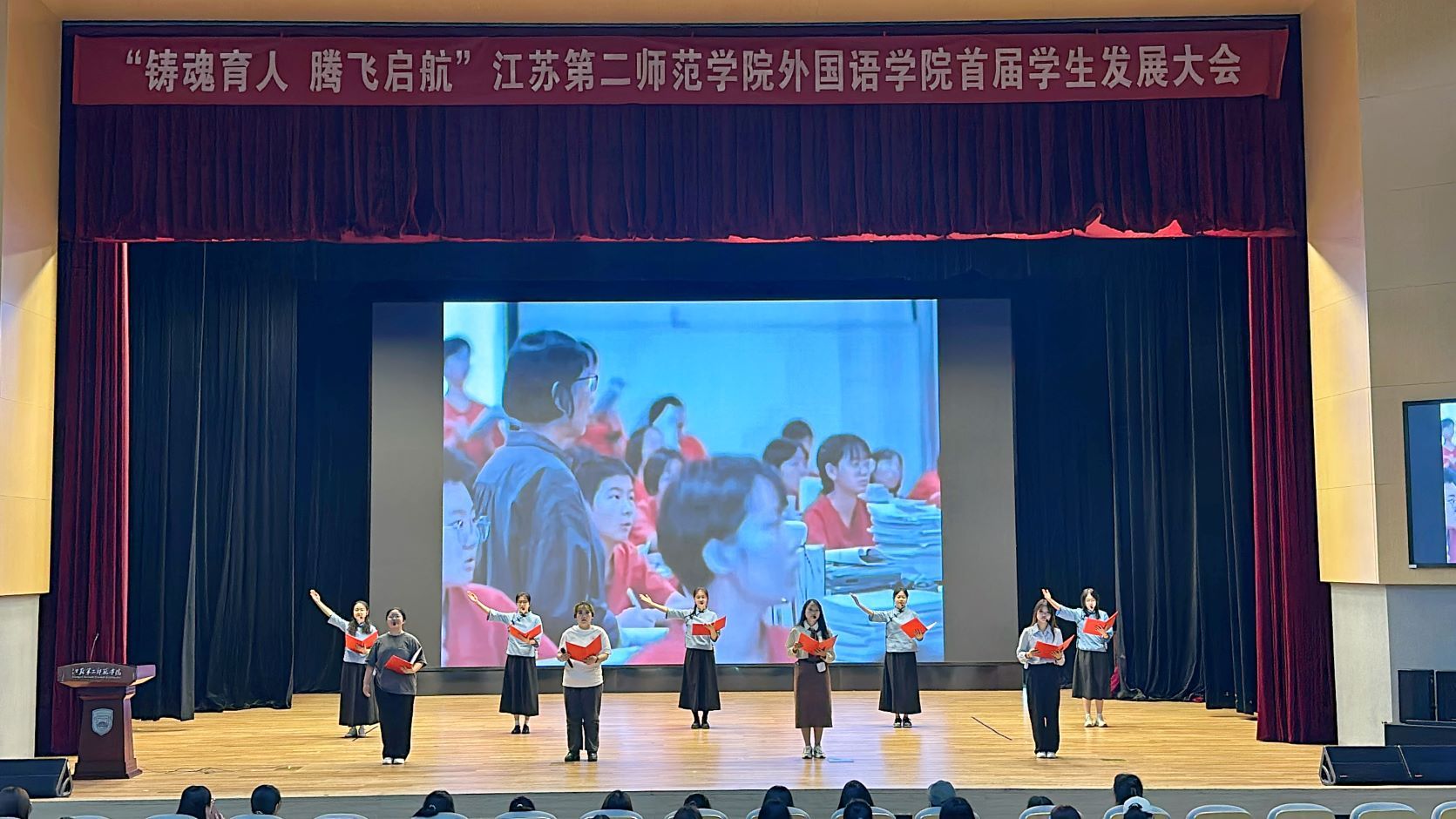 为大力弘扬教育家精神,外国语学院朗诵团队带来了她们的原创朗诵节目:《时光隧道里的教育之光》。该节目在我校“弘扬教育家精神,争做时代大先生”诵读比赛中荣获特等奖。