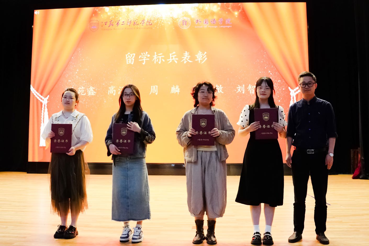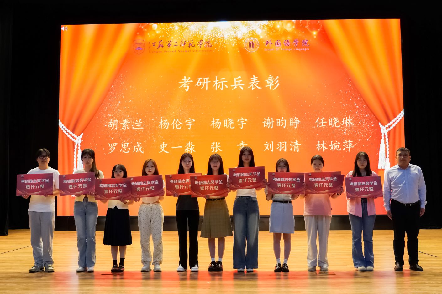 大会的第一阶段对优秀学生及先进集体进行表彰。外国语学院副院长陈光兵、党总支书记余鑫、院长张莉分别为在留学、考研及考编中表现优秀的同学颁发“留学标兵”、“考研标兵”、“考编标兵”等荣誉奖项,并对优秀考研同学颁发考研励志奖学金。党委宣传部副部长王艳、招生就业处处长司南分别为省级奖项获得者和国家奖学金获得者颁发获奖证书。