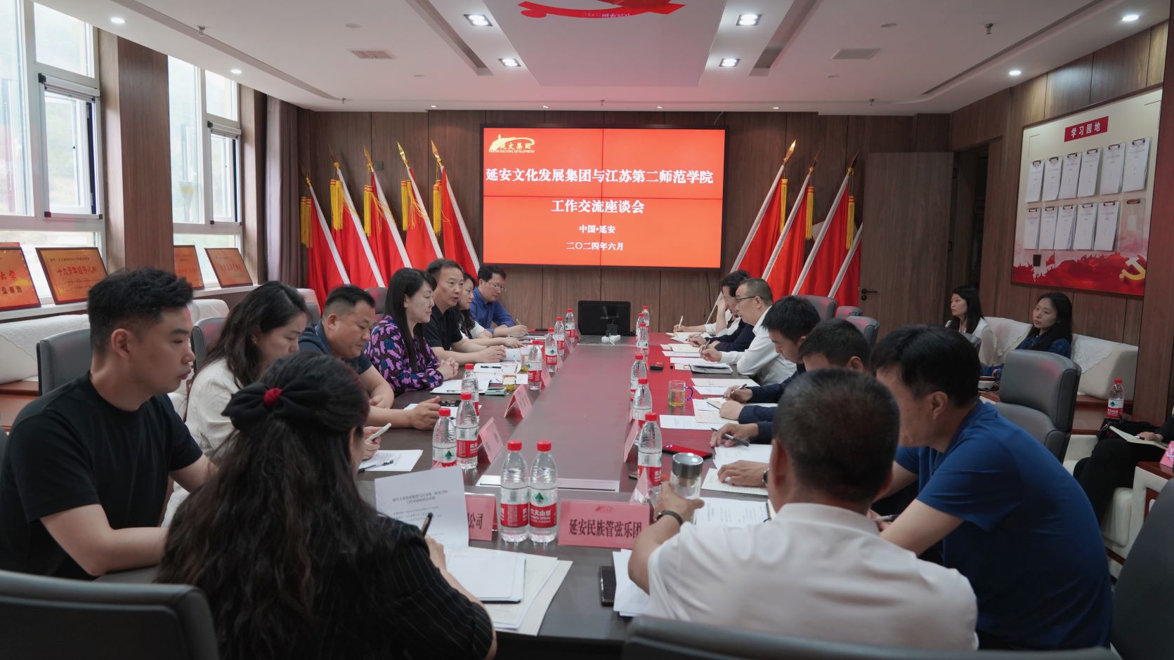 延安市教育局有关负责人,延安励博中学、延安歌舞剧团、延安民族管弦乐团、延安铸魂红色文化培训有限公司等负责人参加座谈会。与会同志围绕“征程万里”项目实施落地、教师教育培训、联合创作申报文化项目、联合培养文化艺术人才、党建活动和“红培”合作等方面进行了深入研讨。