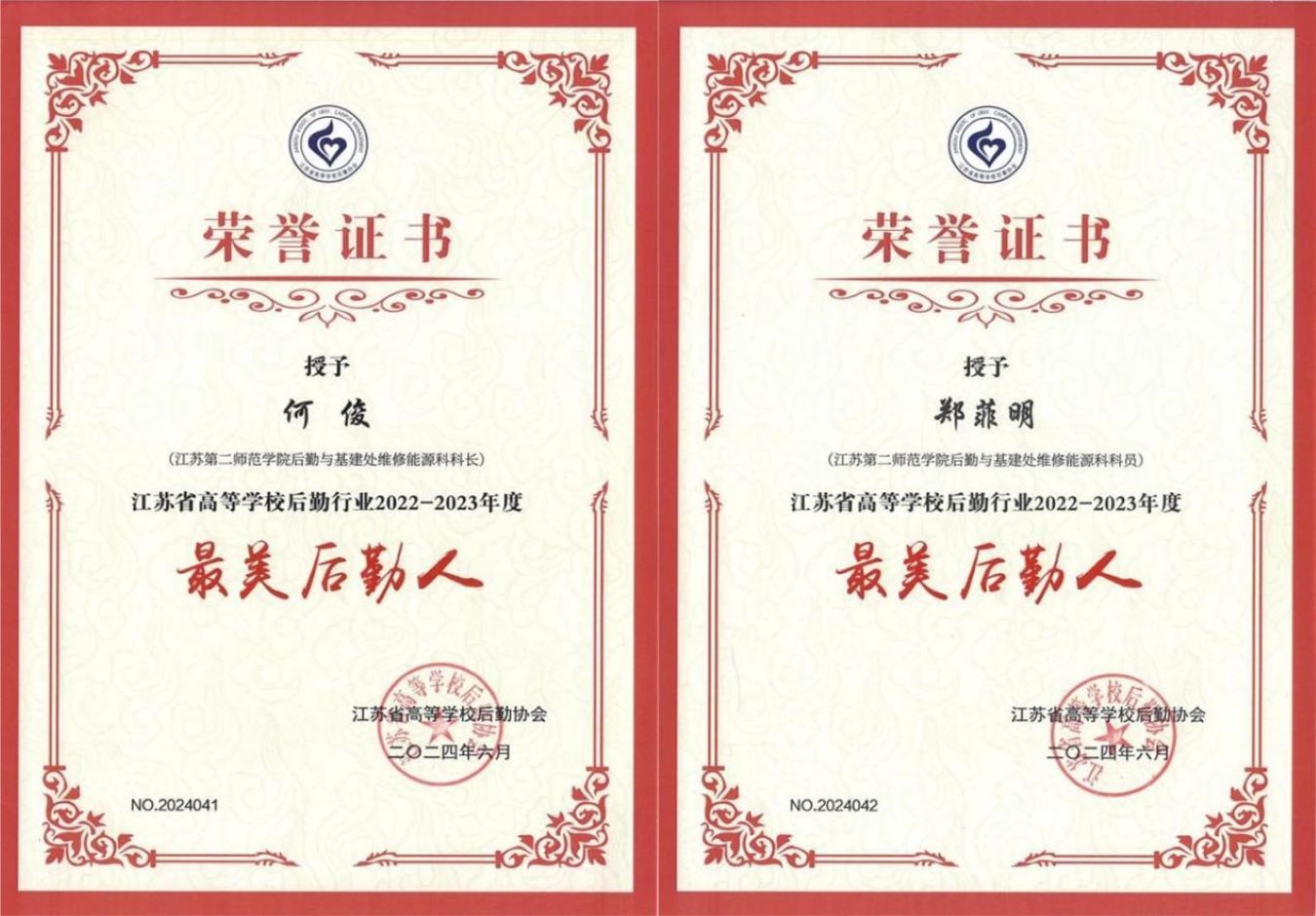 何俊、郑菲明两位同志获评“江苏省高校后勤行业2022-2023年度最美后勤人”。