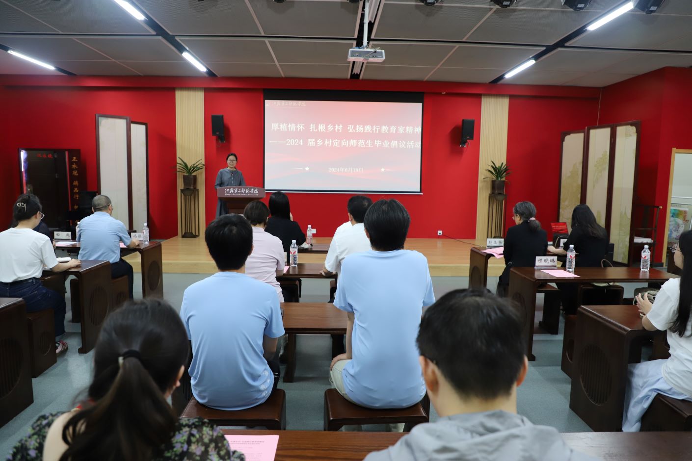 6月19日,我校在石湫校区尚美楼六艺大讲堂举行2024届乡村定向师范生毕业倡议活动。党委书记王鲁沛,党委副书记、副校长刘继红,副校长赵玉蓉出席,相关职能部门负责人,文学院、崇德书院全体2024届乡村定向师范生以及其他班级乡村定向师范生代表参加。活动由人文学部党工委书记刘莹主持。