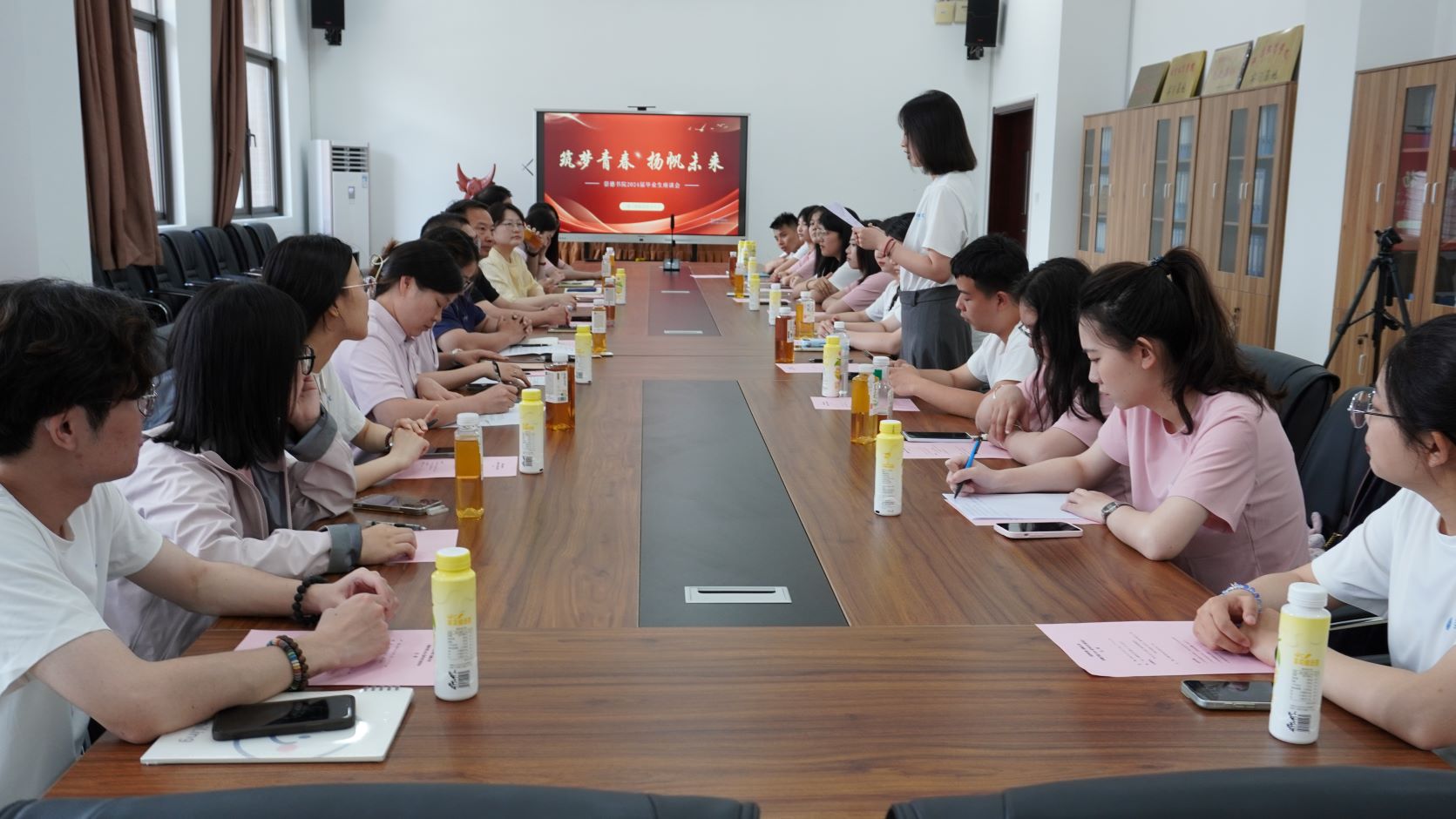 会上,毕业生代表结合个人升学、考编经历及职业规划发展发言。20级应用心理学专业的宋雨轩同学分享了自己在大学四年中作为学生骨干的一些感悟和体会,表示正是这些历练和平台让她在各种场合都有信心和底气,感恩母校的培养。20级教育技术学普本班的王小甜同学分享了自己成功通过无锡教师编制考试和考研的经历。她提到,去年自己最迷茫、彷徨的日子,是辅导员的一句“先拥有,后选择”的话,让她豁然开朗。她明确了目标,加倍努力,最终收获满满。22级学前教育转本班的韩卓非同学汇报了自己参与昆山市乡村振兴计划的经历,立志在未来工作中充分发挥专业知识,在基层的广阔天地中大展作为。