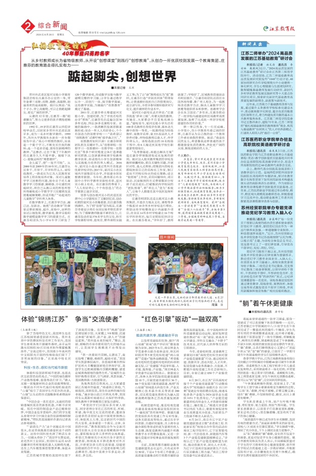 本报讯(记者 汤文清 通讯员 李安林 戴晓凤)近日,“2024高品质发展的江苏基础教育”研讨会在江苏第二师范学院举行。活动现场,江苏二师基础教育高品质发展研究院发布“1040”行动计划,40家协同研究合作学校围绕大中小幼德育一体化研究、学生心理健康与生涯规划研究、数智赋能基础教育发展行动研究、新时代乡村学前教育发展实践研究等十大重点协同研究项目,探索研究新时代基础教育高质量发展的新理念、新政策与新技术。