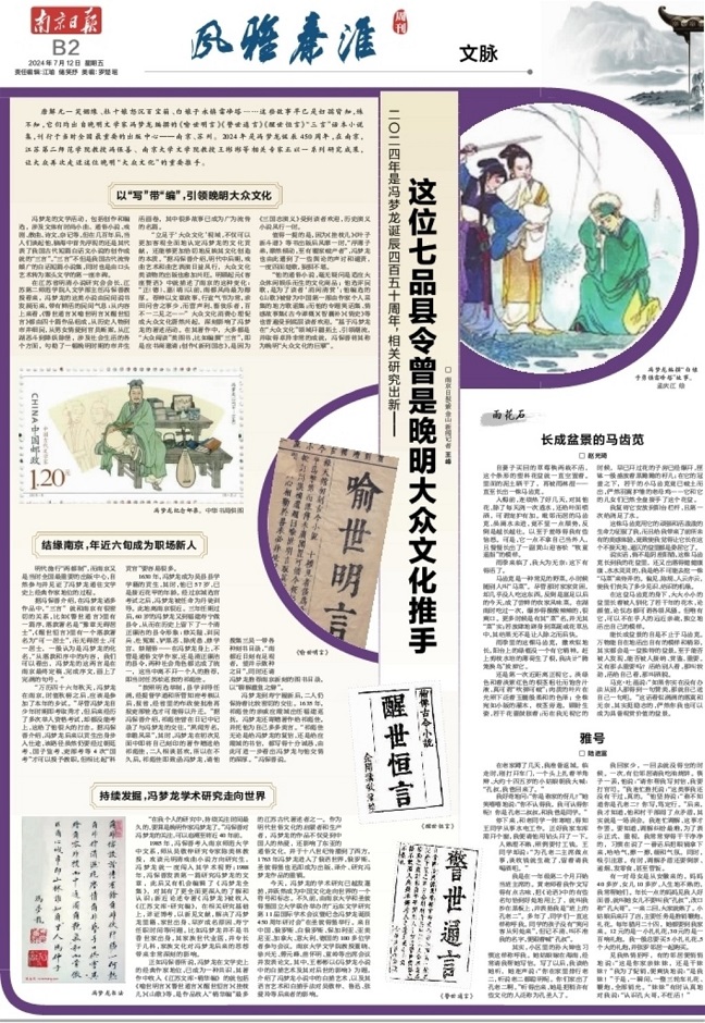 唐解元一笑姻缘、杜十娘怒沉百宝箱、白娘子永镇雷峰塔……这些故事早已是妇孺皆知,殊不知,它们均出自晚明文学家冯梦龙编撰的《喻世明言》《警世通言》《醒世恒言》“三言”话本小说集,刊行于当时全国最重要的出版中心——南京、苏州。2024年是冯梦龙诞辰450周年,在南京,江苏第二师范学院教授冯保善、南京大学文学院教授王彬彬等相关专家正以一系列研究成果,让大众再次走近这位晚明“大众文化”的重要推手。