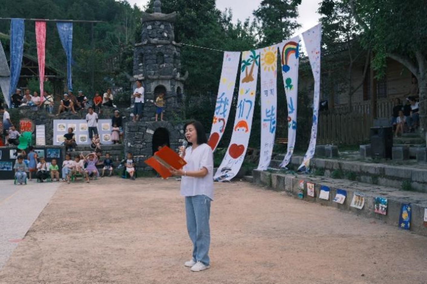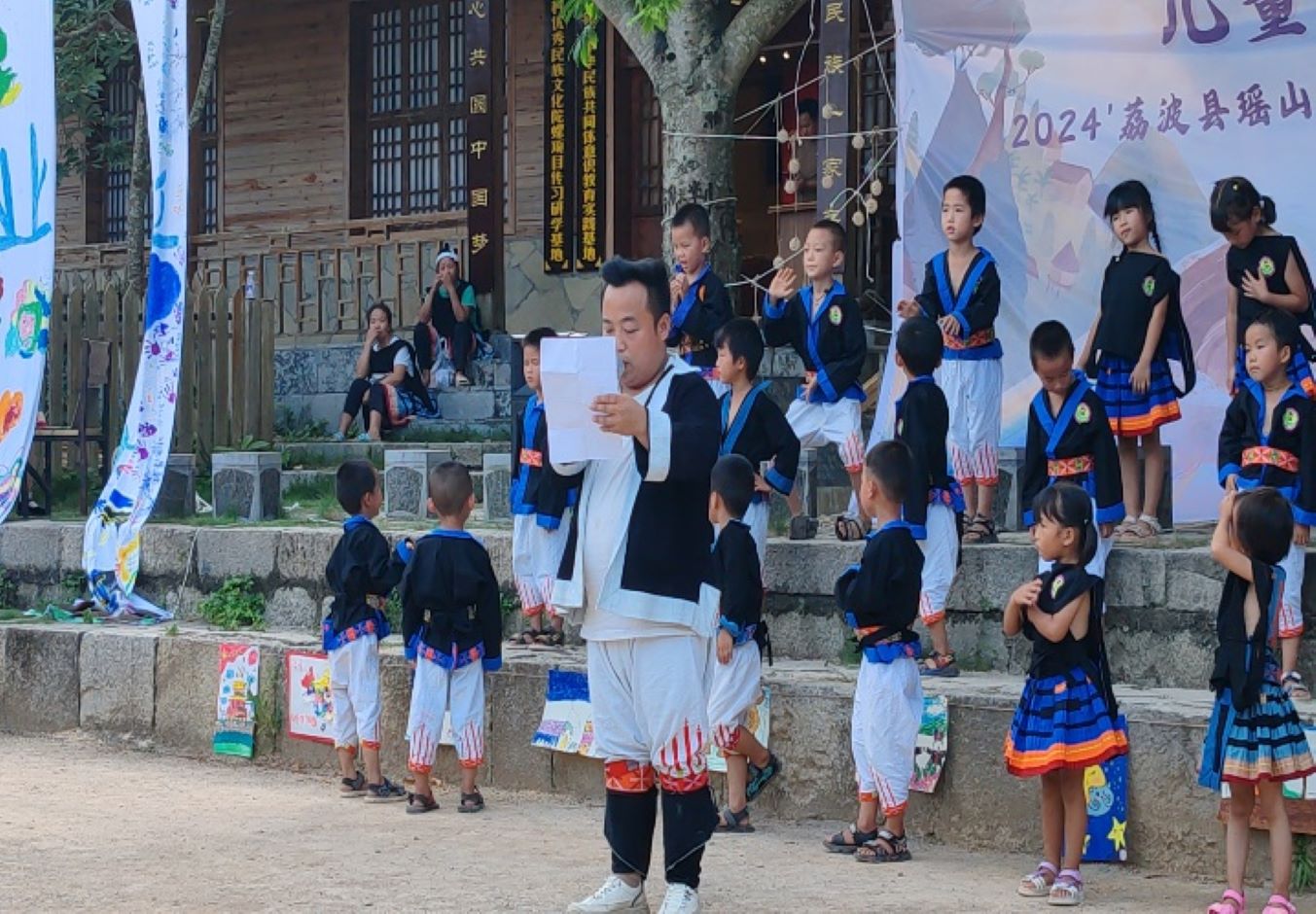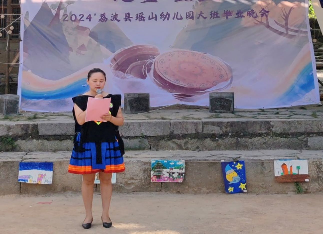 2024年7月12日傍晚,贵州黔南州荔波县瑶山幼儿园一年一度的大班毕业晚会在陀螺竞技场顺利举行。瑶山是江苏第二师范学院长期合作的暑期大学生三下乡社会实践基地,也是江苏二师学前教育学院“彩虹伞·乡园小禾”儿童志愿服务团队举办的“瑶山村晚”系列之二,本次活动迎来了“中国—东盟教育交流周”研习营的专家学者与南师大美育中心的研究生们。