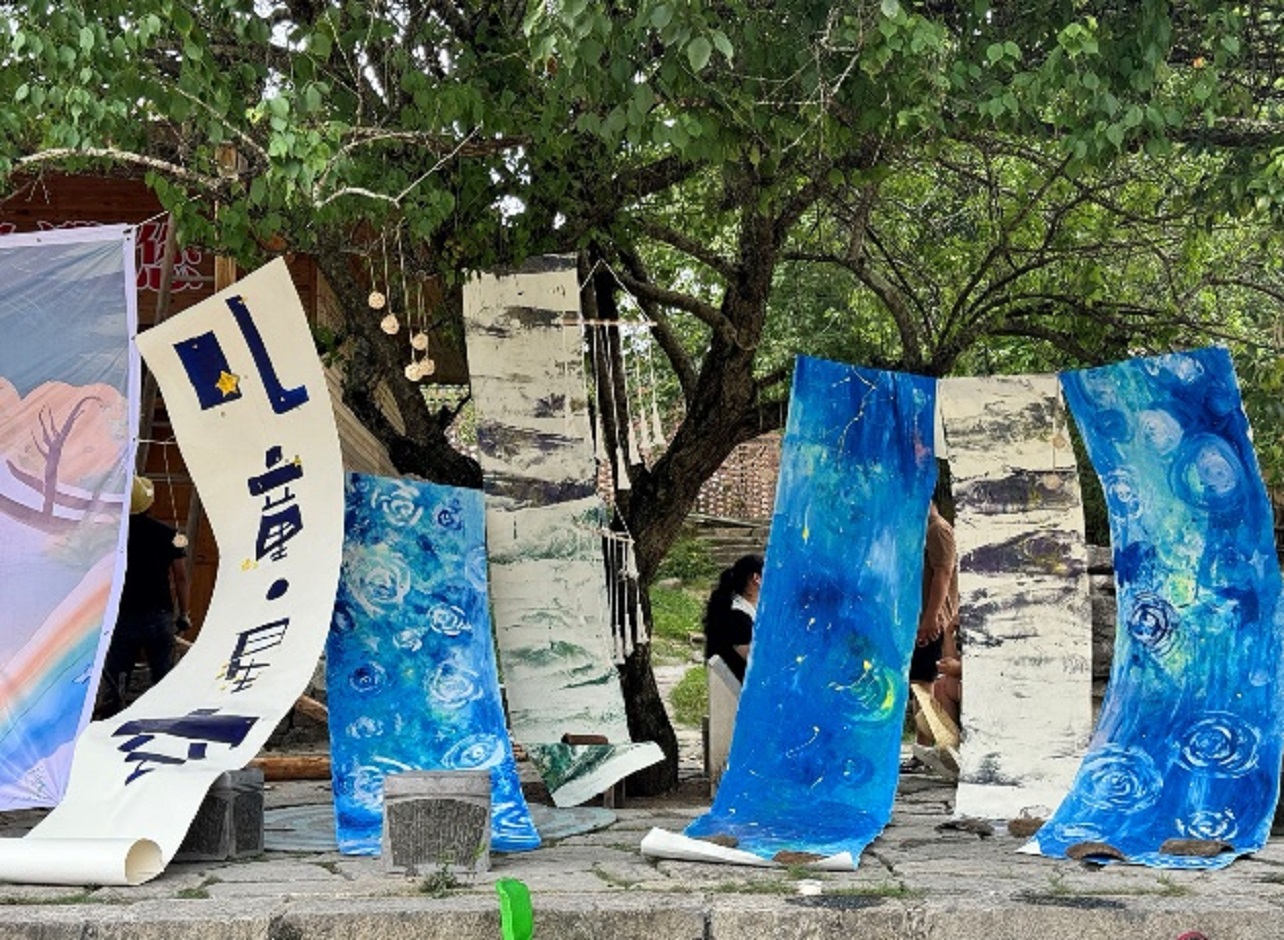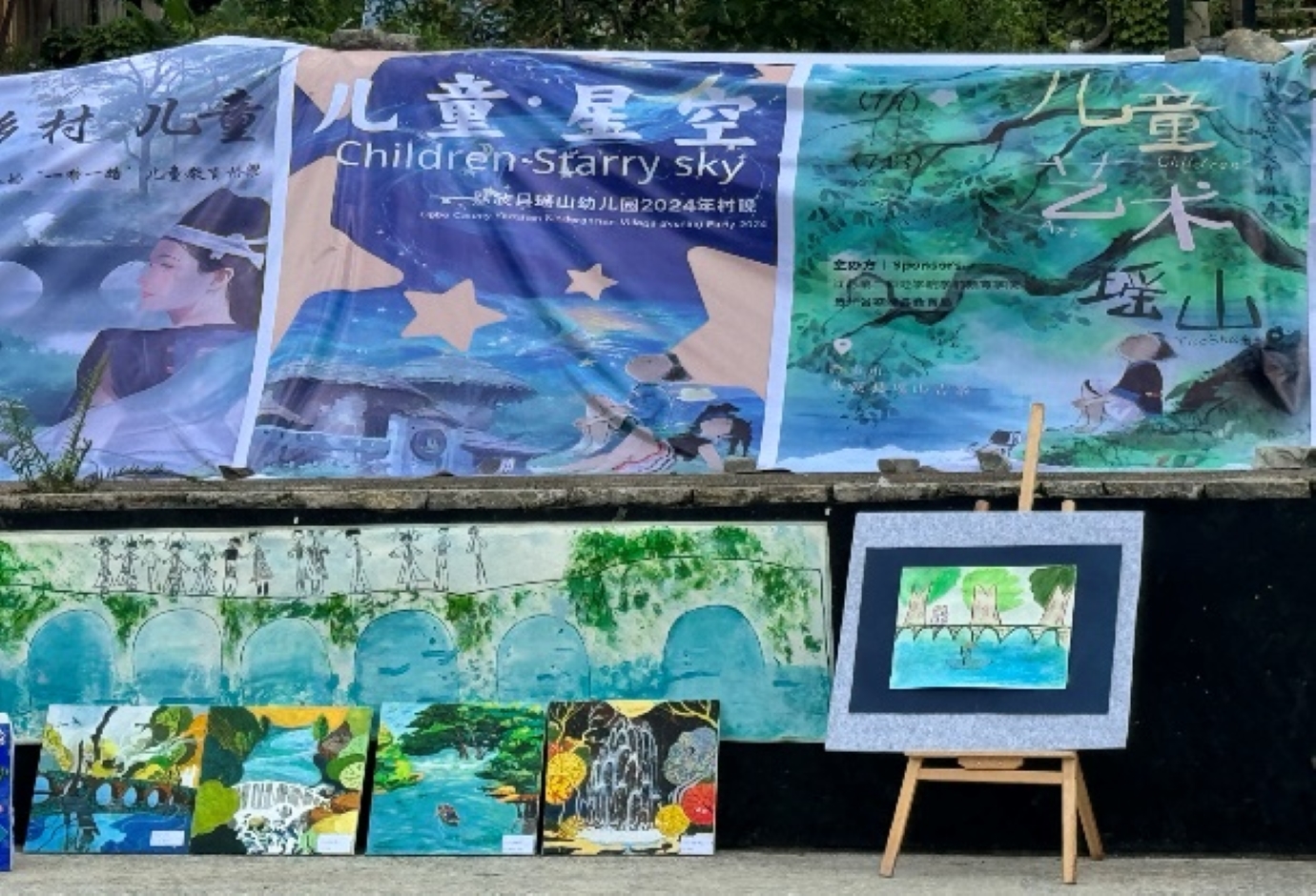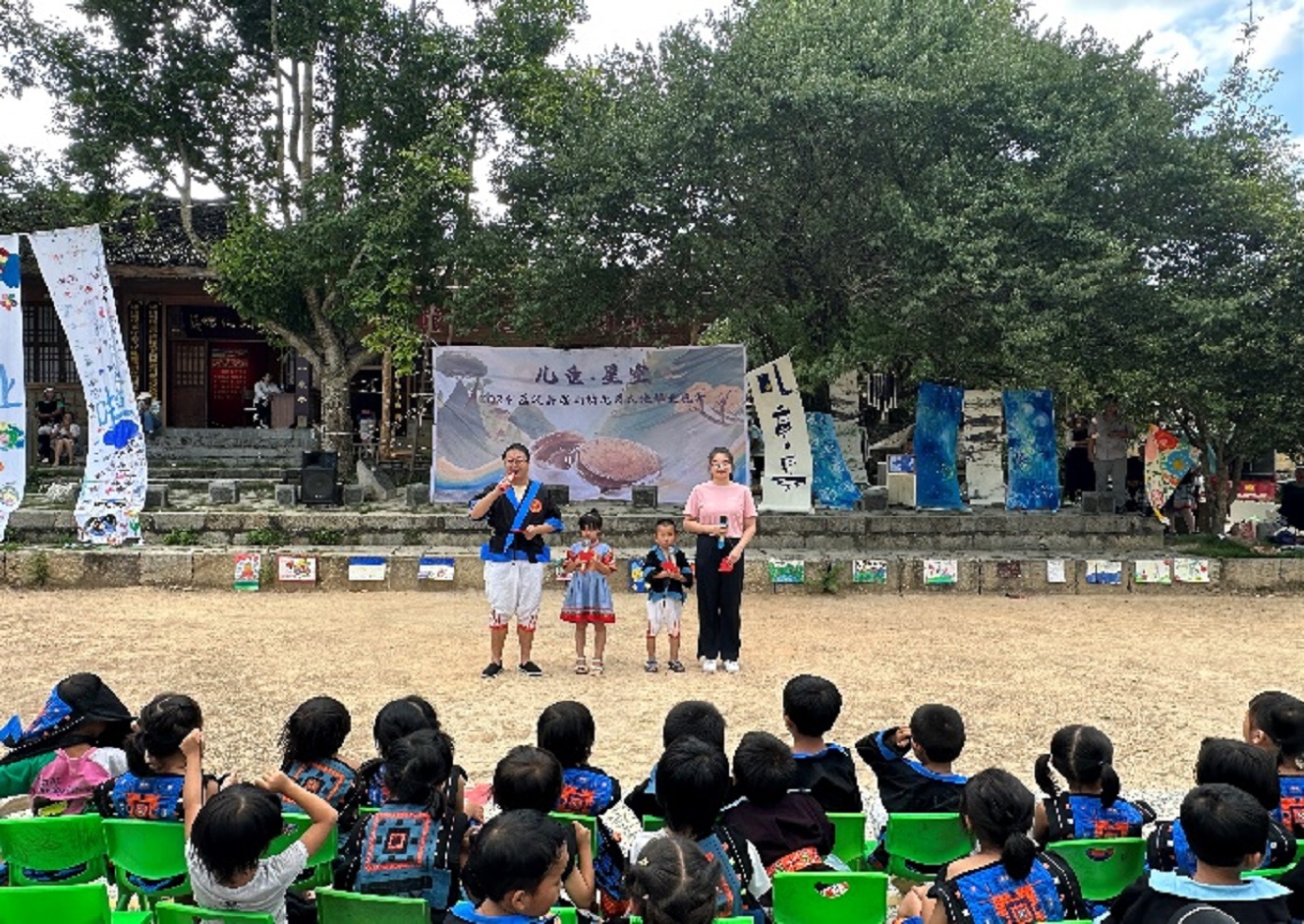 盛夏的傍晚,在瑶山乡聚集欢庆的陀螺竞技场,来自江苏的特级教师与老师们协助瑶山幼儿园的老师齐心协力精心布置现场。两棵大树之间,拉起一块大大的主题幕布,拾级而上便是立体舞台。舞台的周围,一场由荔波县第一、二、三、四、五、六幼教集团联合举办的艺术联展率先拉开序幕,以“小七孔桥”为主题的绘画作品展现了大自然的神奇之处,更是承载着孩子们对乡土特色风景的自豪感与归属感;身着不同民族服装的孩子们跃然纸上,多种材料交织,绘出无比瑰丽的民族情、中华情;用吸管吹着四散的颜料,吹出自己的遐想,或是关于现在,或是关于未来,绚丽而多彩。展现出师生及家长共同创作的艺术结晶。每位小嘉宾在特别设置的签到区留下稚嫩的签名,记录这珍贵一刻,也是艺术展示的一部分。