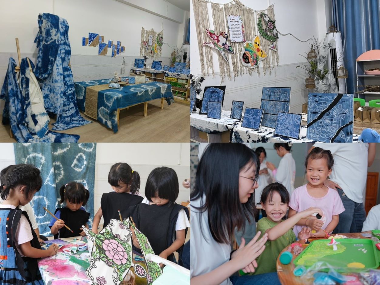 “彩虹伞·乡园小禾”团队不仅为瑶山的孩子们带去了丰富的画笔和绘本,同时深入挖掘并开发了本土教育资源,创建了丰富的“儿童绘本工坊”与“儿童艺术工坊”。其中,绘本工坊规划成三个大区域:一是桌椅摆放整齐,光线明亮,适宜中大班孩子进行阅读、前书写和图书修补的区域;二是有地垫铺设、纱帐围立和沙发组合,适宜小班孩子的舒适阅读区;三是地方比较宽敞、备有道具橱柜和衣架、用座垫做隔断的童话剧表演区。艺术工坊设计规划分为了四大区域:扎染区,色彩区,手工区和陶艺区,充分考虑了瑶山的自然资源如扎染、树枝、泥土等收集和运用,同时也把现代时尚的色彩元素融合在区域中,让孩子们既感受到熟悉的生活,又接受色彩带来的时尚冲击,激发灵感,充分创造。