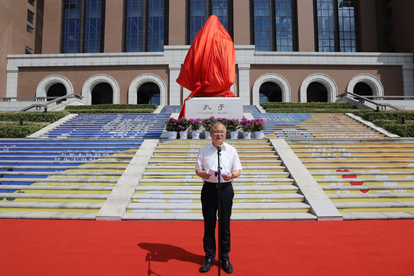 校党委书记王鲁沛致辞,他指出,在第40个教师节来临之际,举行孔子像揭幕仪式具有特殊而重要的意义。两千多年来,以孔子为代表创立的儒家文化博大精深,构成了中华民族传统文化的主流和基础。孔子教育思想博大精深,“有教无类”“因材施教”“不愤不启、不悱不发”等,都对现代教师教育产生深远影响。习近平总书记在致信全国优秀教师代表时提出要“大力弘扬教育家精神”,这是在教育强国宏伟目标引领下对教师队伍高标准建设提出的新要求。师范院校承担着培养高素质专业化教师队伍的重任,孔子像的落成是学校继承中华优秀传统文化、营造尊师重教浓厚氛围的一件大事,是对中国特有的教育家精神的传承和弘扬,学校将一如既往地大力弘扬和践行教育家精神,努力回答好“强国建设、二师何为”的时代命题。