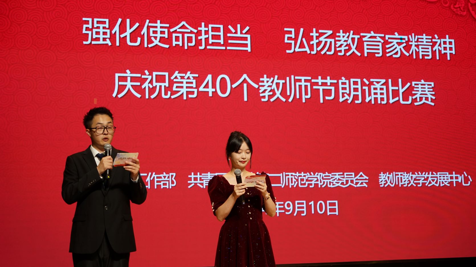 9月10日晚,我校在尚美楼剧场举行“强化使命担当,弘扬教育家精神”庆祝第40个教师节诗歌朗诵比赛,比赛由新生辅导员余永童、仇奕翔主持,卜玉平、刘莹、冯颖、戴晓凤、吴迪等5位老师担任比赛评委。500名新生代表观看了比赛演出。