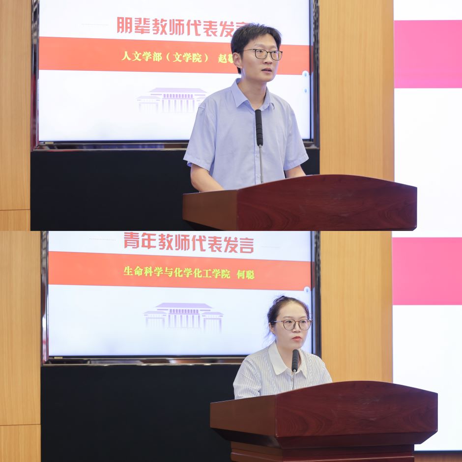 人文学部副主任、文学院副院长赵敬鹏代表朋辈教师发言,与学员分享了个人成长的宝贵经验。生命科学与化学化工学院何聪代表青年教师作了表态发言。