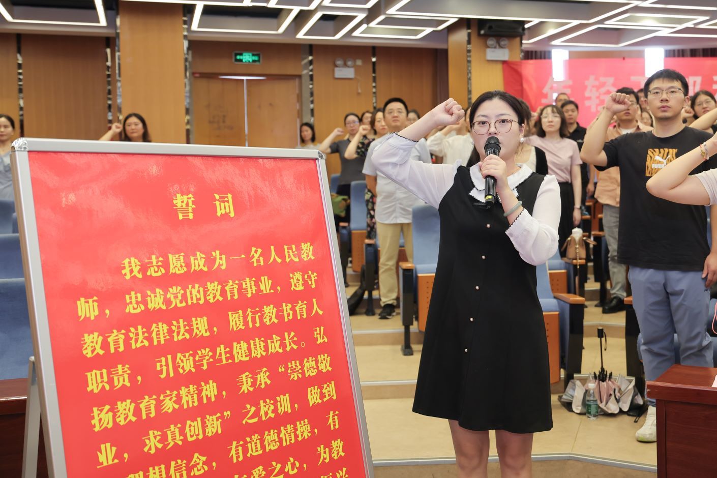 随后举行了入职宣誓仪式和赠书活动。在商学院孙晶晶博士的领誓下,全体新入职教师进行入职宣誓。党委教师工作部(人事处)部长(处长)左霞同志为培训班学员代表赠送了人民教育家于漪先生的个人自传《岁月如歌》以及《教育的目的》《大学何为》《人工智能与未来教育发展》等书籍。
