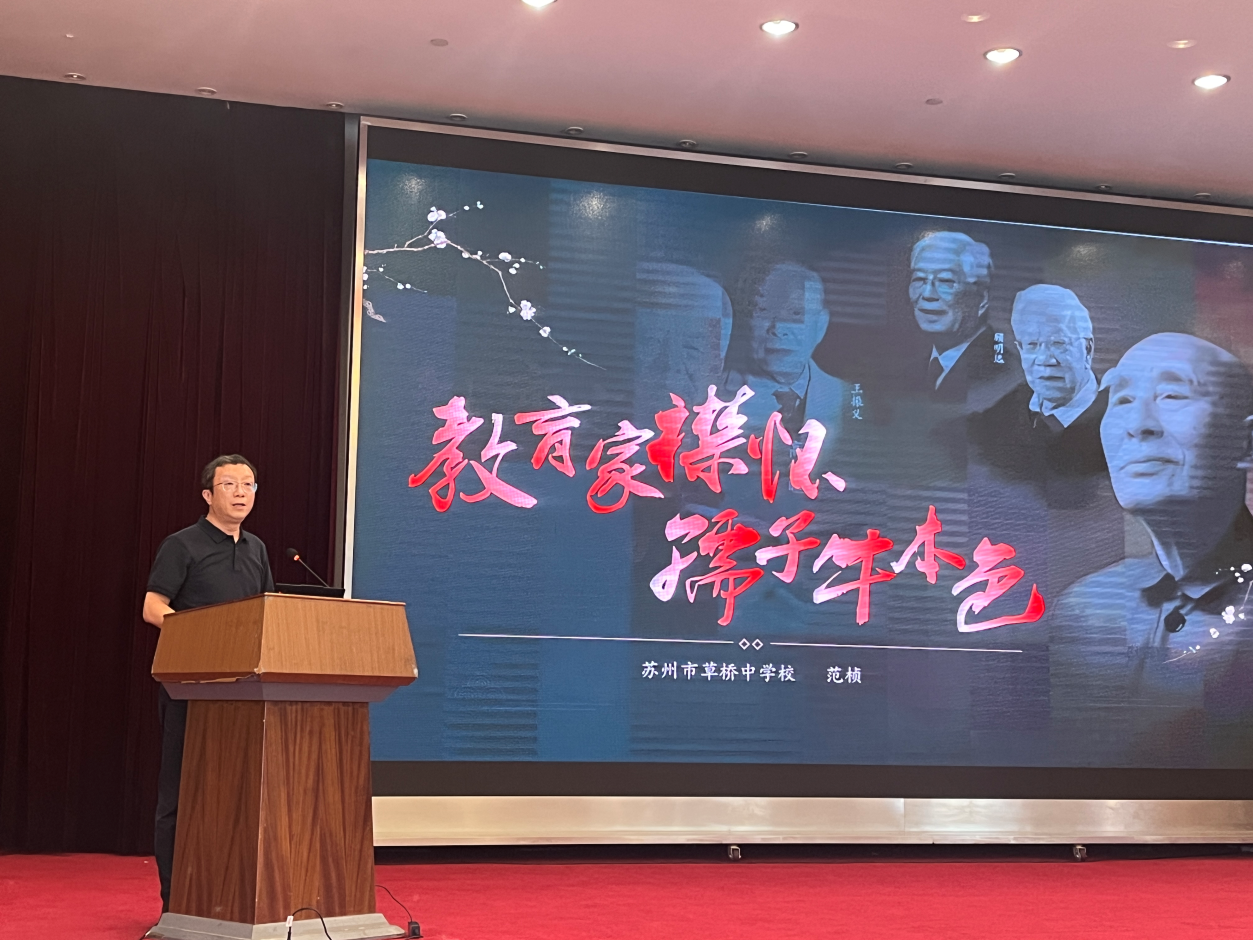 苏州市草桥中学校党委书记、校长范桢以“教育家襟怀 孺子牛本色”为题做分享,强调教师是立教之本、兴教之源,明确了教育家精神的六个内涵及弘扬其实践意义。他介绍,草桥中学校通过设立教育家宣传墙、构建“师说文库”“圣陶书屋”等方式推进教师专业修炼,凝聚内在力量。其中,叶圣陶四有好教师团队作为先锋实验团队,以“教育家襟怀”坚定理想信念,以“孺子牛本色”表达躬耕态度,致力于将团队成员培养成师德师风典范、教书育人示范、教研科研模范,全景式呈现“教育家型教师”成长风貌,努力办人民满意的教育。