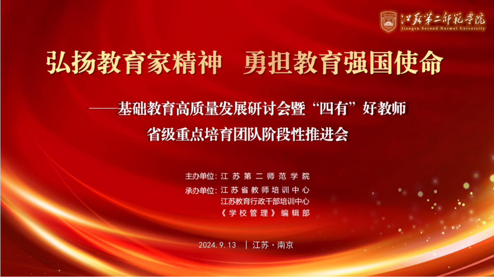 为深入学习贯彻党的二十届三中全会精神,认真落实习近平总书记在全国教育大会上的重要讲话精神,大力弘扬教育家精神,持续推进新时代高素质专业化教师队伍建设,2024年9月13日,由省师干训中心和《学校管理》编辑部承办的“弘扬教育家精神 勇担教育强国使命——基础教育高质量发展研讨会暨‘四有’好教师省级重点培育团队阶段性推进会”在南京举行。