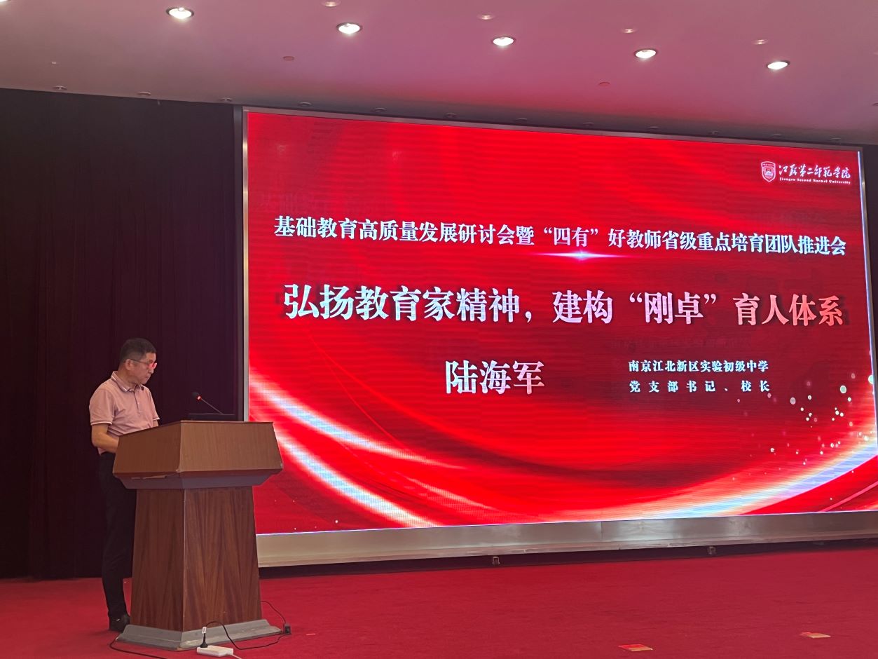 南京江北新区实验初级中学党支部书记、校长陆海军作题为“弘扬教育家精神,建构‘刚卓’育人体系”的交流分享。他介绍学校赓续“刚卓”文化,打造“三声四学”高效课堂,创设集体备课“3521”流程制度,挖掘特色国防教育资源,改革教育评价体系,筑牢家校协同育人,从学生成长、教师发展、课堂变革、学校治理、教育资源、评价改革、家校合作等七个方面全力构建“刚卓”育人体系,以“刚卓”文化的实践推动学校实现高质量内涵式发展。