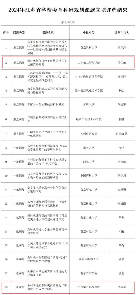 9月14日,江苏省学校美育教学指导委员会公示2024年省学校美育科研规划课题立项评选结果。我校美术学院孙仕荣老师的《新时代师范院校美育协同模式及实施策略研究》获评重点课题;崇德书院侯家英老师的《乡村幼儿园教师美育素养的“在地化”生成路径研究》获评一般课题。