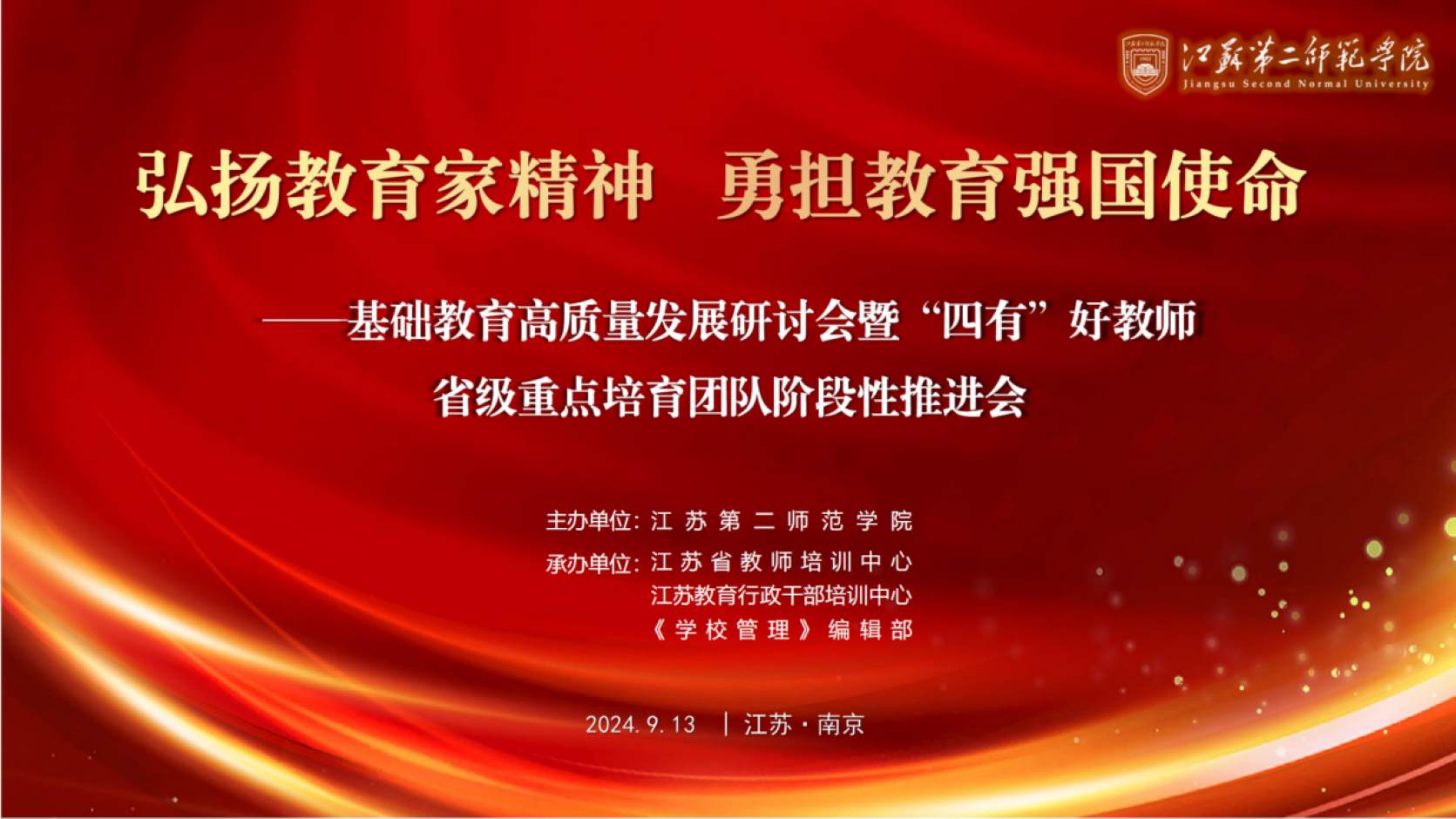 9月13日,由省师干训中心和《学校管理》编辑部承办的“弘扬教育家精神 勇担教育强国使命——基础教育高质量发展研讨会暨‘四有’好教师省级重点培育团队阶段性推进会”在南京举行。