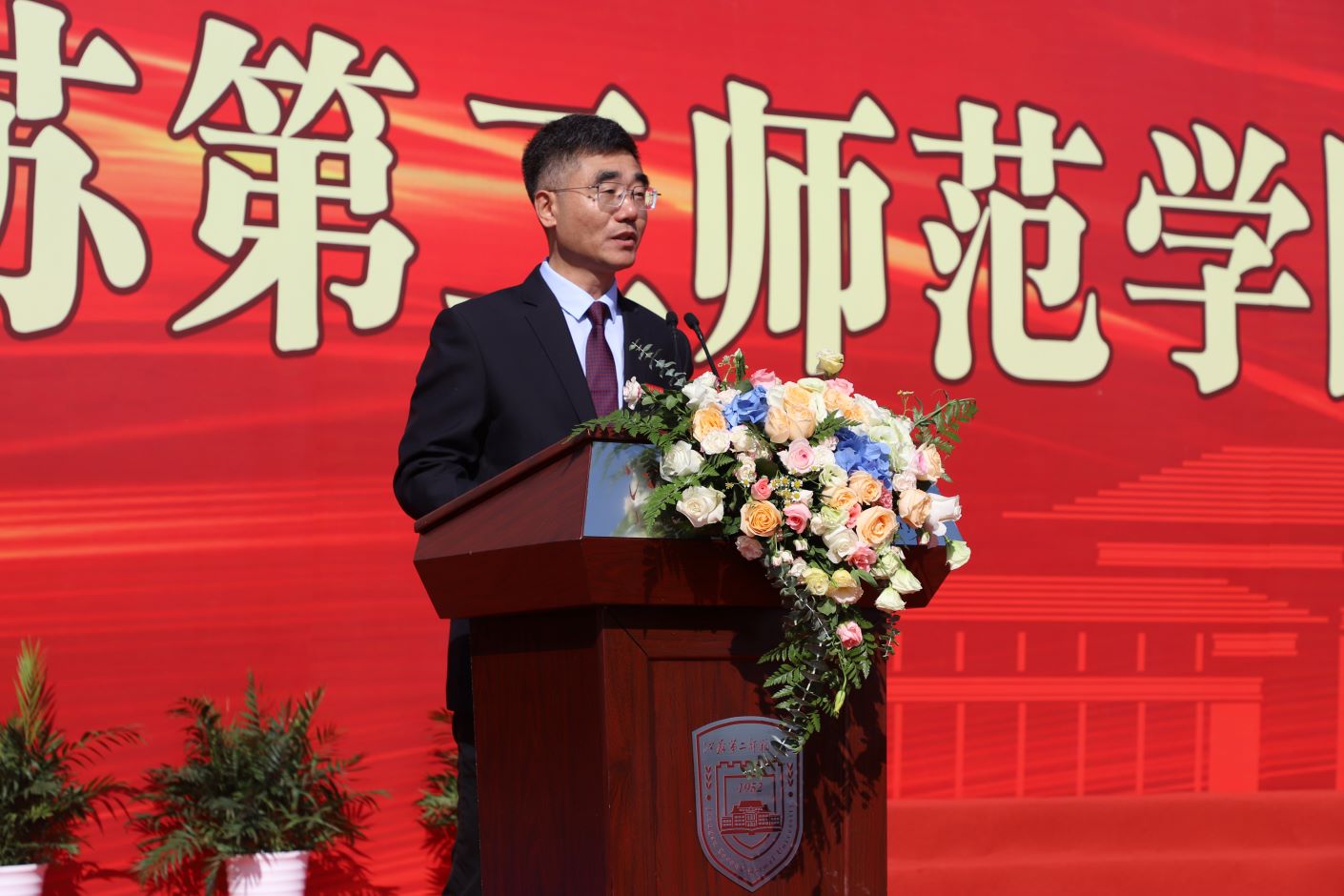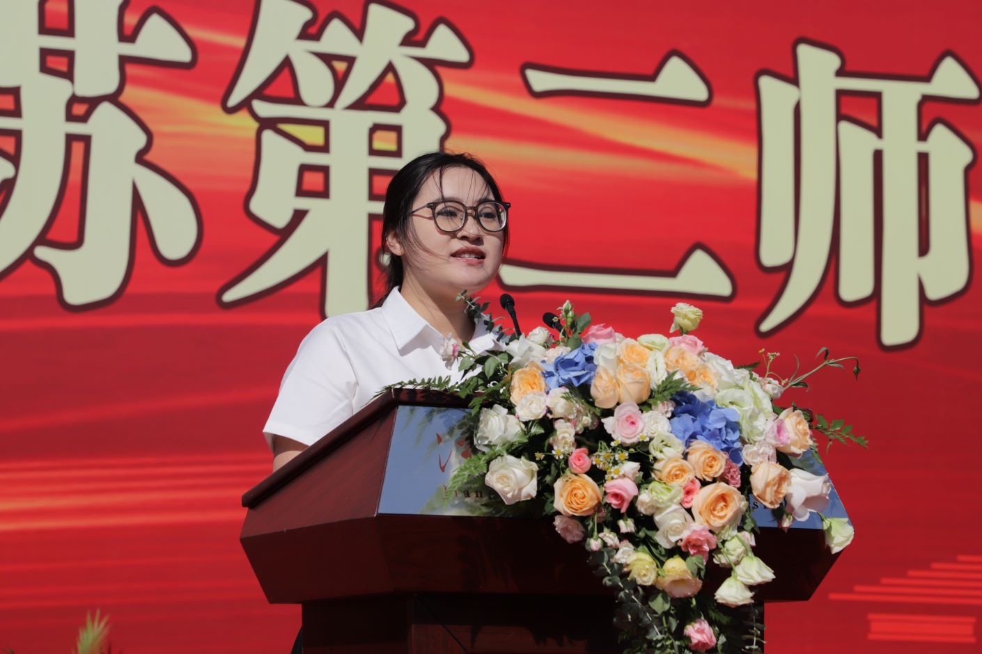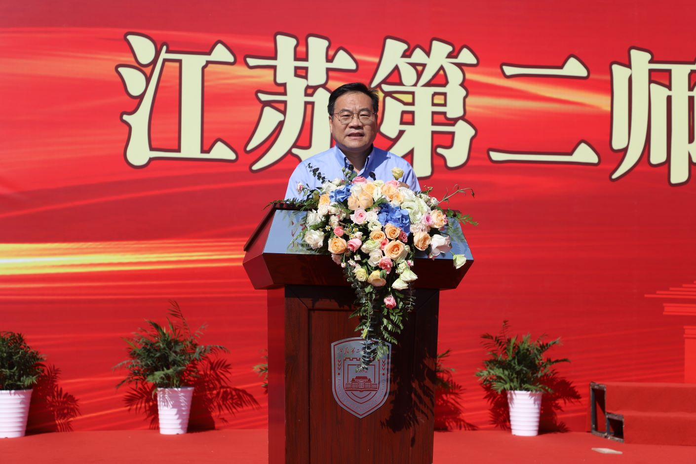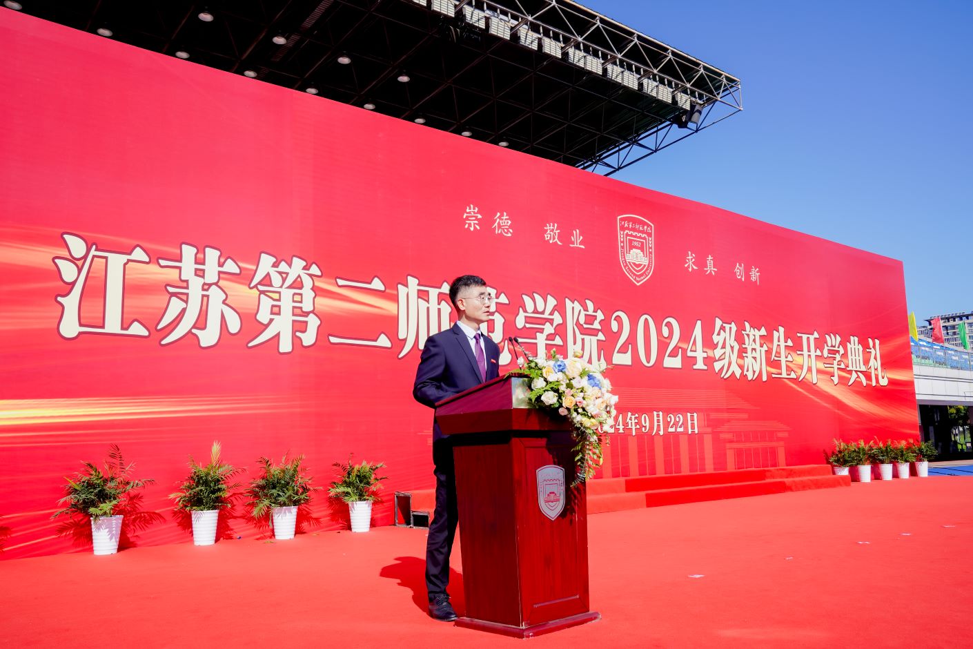 徐国华代表全校师生员工欢迎新同学来到江苏二师开启人生新征程。他以《载梦起航再出发,努力成为新时代的卓越青年》为题作讲话。他表示,同学们选择了二师,立志在这里载梦起航,成为二师开启高质量发展新征程中迎来的新一批见证者和参与者,也必将是二师新辉煌的创造者和书写者。他向同学们讲述了二师的历史和成就,并郑重承诺学校会殚精竭虑、千方百计,努力为同学们的成长成才提供更好的条件和保障。希望大家担起爱校、荣校、兴校、强校的责任,把大学时光过得充实精彩而有意义。