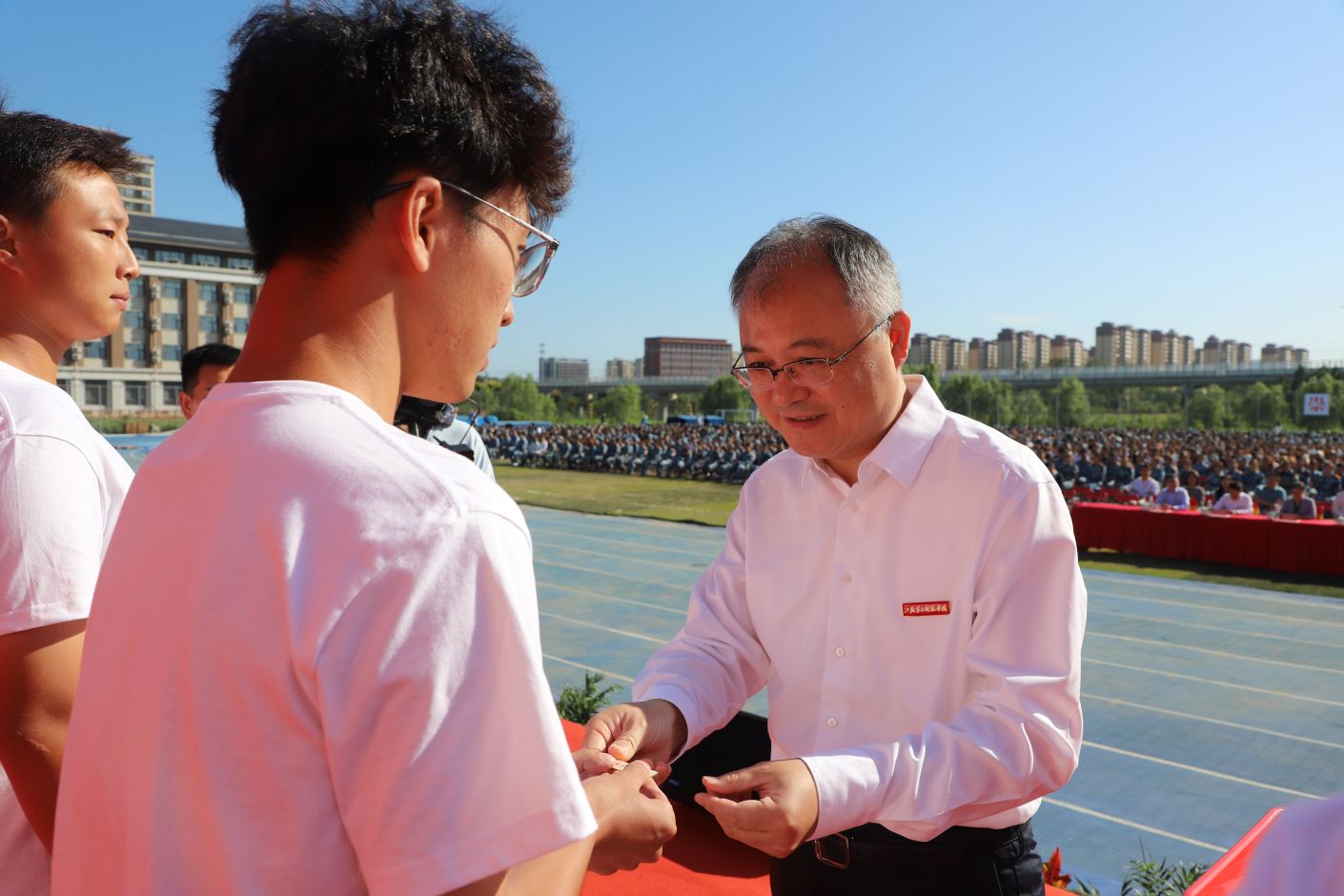 王鲁沛为各学院(学部、书院)学生代表、留学生代表赠送校徽,全体新生们郑重地将江苏二师校徽戴在胸前。校徽承载着学校的荣耀和师生的努力,是江苏二师精神的象征,佩戴上校徽,标志着同学们从此与学校心心相通,血脉相连。王鲁沛勉励全体新生要有敢为人先的锐气,勇于解放思想、与时俱进,敢于上下求索、开拓进取。希望同学们弘扬“崇德敬业、求真创新”的学风,以教育家为榜样,大力弘扬教育家精神,勤于学习、敏于求知。
