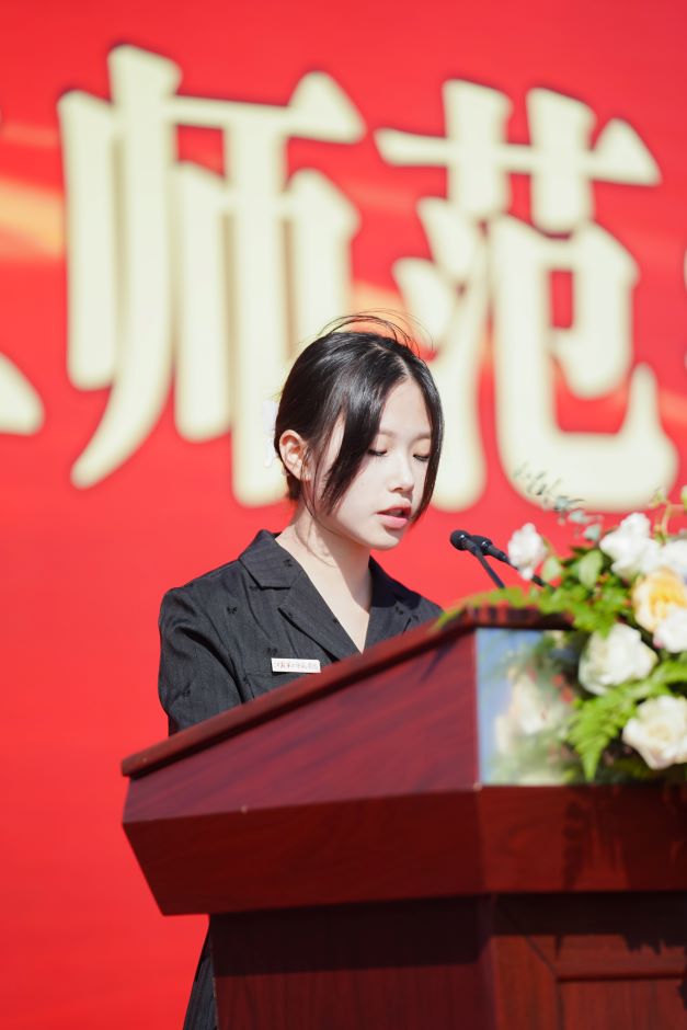 2024级英语(师范定向)普本班倪梦瑶在今年的高考中以637分的优异成绩考入我校,她作为新生代表发言。她说,生于教育世家的她,在孩堤时代就梦想走上三尺讲台成为一名人民教师。而今,走进底蕴深厚的二师校园,她必将教育家精神之树扎根心里,让它蓬勃生长。作为定向师范生,她认为,风里雨里总有人在翘首等待,等待着他们的归去。她承诺会勤学好问、刻苦钻研,习得本领,完成与故乡的一场双向奔赴。
