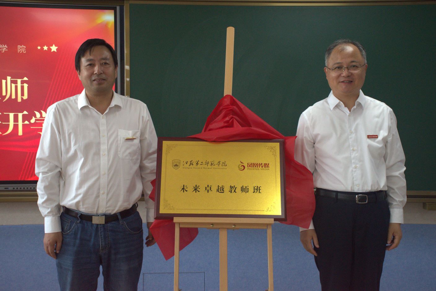 开学典礼上,王鲁沛和蒋波为凤凰•二师“未来卓越教师班”揭牌。