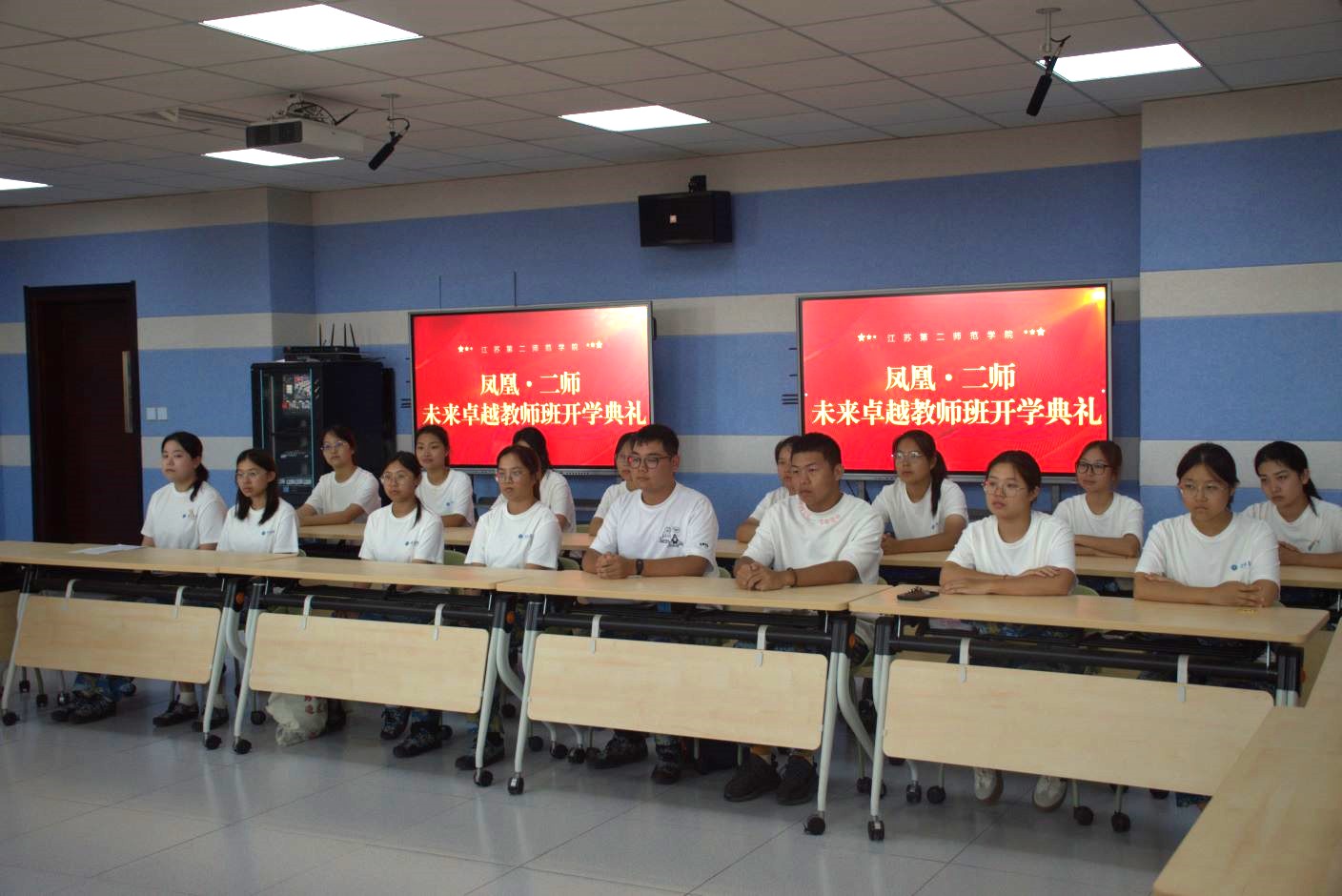 为强化教育家精神引领,推动高质量师范教育建设,培养新时代高素质专业化教师队伍,切实落实我校《新时代师范生培养实施方案》中提出的“培养具有深厚卓越教师潜质的优秀教师”目标。9月22日上午,教育科学学院、崇德书院在石湫校区举行凤凰•二师“未来卓越教师班”开学典礼。我校党委书记王鲁沛,党委常委、副校长皇甫立同,教务处处长仇方道,质评处处长、教师发展中心顾晔峰,(教育学部)教育科学学院院长蒋波,崇德书院党总支副书记王晶,教育科学学院专任教师奚润,崇德书院辅导员卢园园以及“未来卓越教师班”全体同学出席仪式,教育科学学院党总支书记丁莹主持。