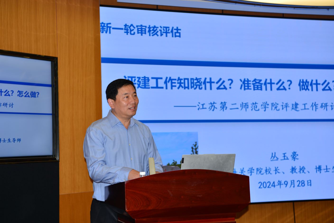 丛玉豪以“评建工作知晓什么?准备什么?做什么?怎么做?”为主题,结合我校办学历史、特色,从新一轮审核评估精髓要义、主要特点、主要流程、对我校评建工作的宏观建议和中观建议等五个方面,对我校本科教育教学审核评估评建工作做出指导。