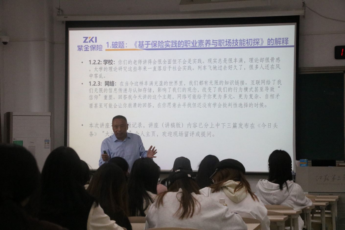 讲座中,王永峰围绕“四问”展开详实的讲解:我们为何要展现自我?职场中哪些年轻人能脱颖而出?金融职业所需的专业素养与大学应做的准备是什么?为何建议尽量读研?他深入剖析了保险和金融行业背后的奥秘,以及从业人员应具备的职业素养和职场技能。同时,结合保险和金融行业的实践案例,生动展示了职业素养和职场技能在实际工作中的应用,让学生对行业企业有了更加直观的认识,激发了大家对未来职业生涯的憧憬和期待。