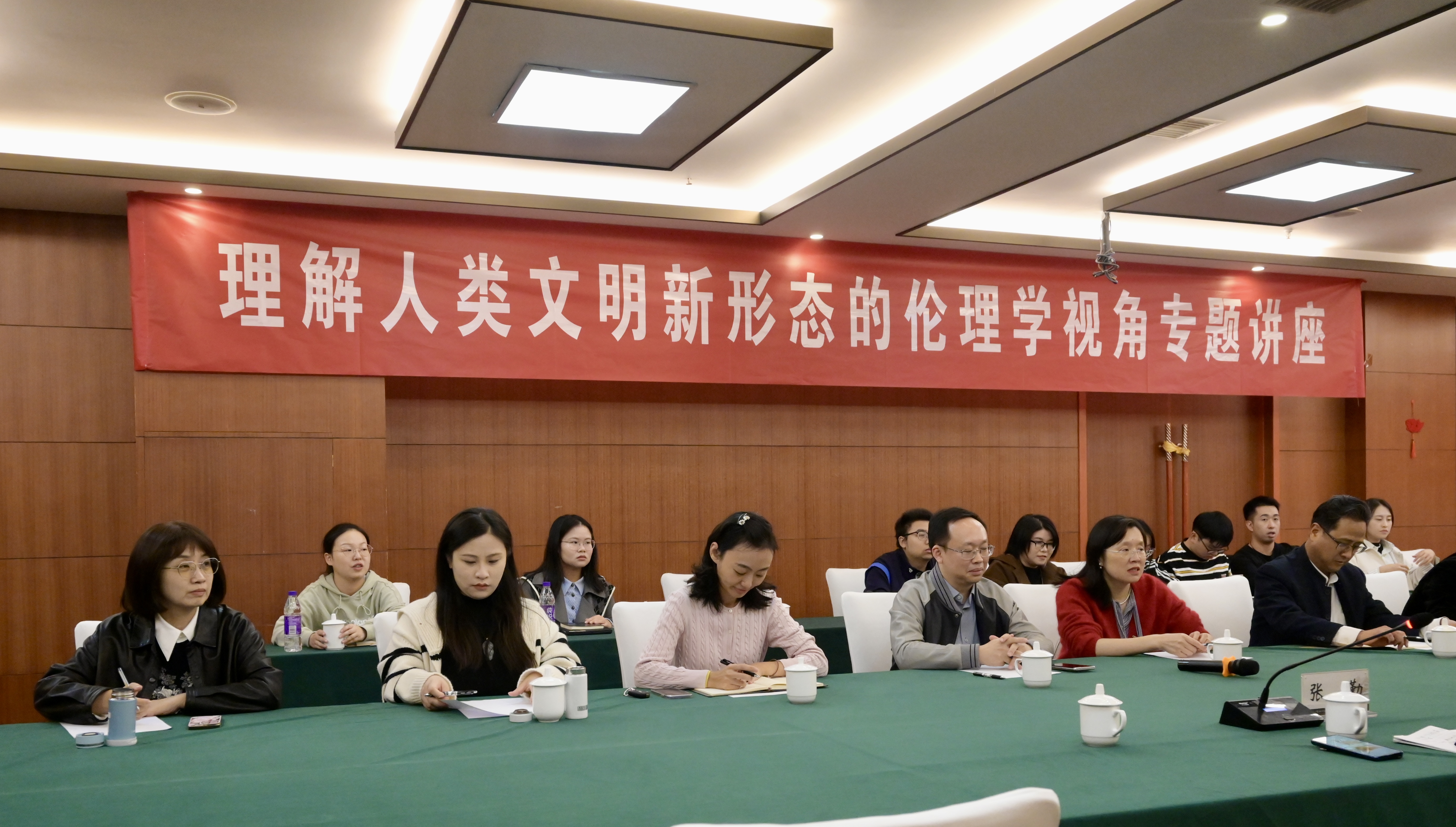孙春晨从“第二个结合”为人类文明新形态奠定伦理根基、人的全面发展是人类文明新形态的伦理标识、人与自然和谐共生是人类文明新形态的伦理要求、全人类共同价值是人类文明新形态的伦理共识、以及有待进一步深化研究的问题等五个方面深入浅出地讲解了中国式现代化与人类文明新形态等重大命题的伦理学意蕴,引发与会者的热烈讨论和深入思考,李安林、高娟、朱隽琪等多位中青年学者就AI科技伦理、生态伦理、数字化与人的主体性等学术问题进行互动。