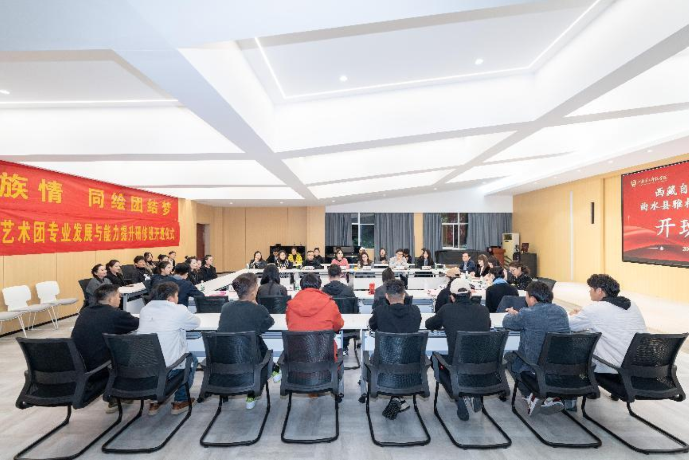 开班式结束后,雅松艺术团在音乐学院舞蹈房进行专业展示汇报,表演了《扎西雪巴》《格桑央恰》《喜马拉雅的雪》《欢迎你到曲水来》等歌舞作品。随后,授课教师根据专业汇报情况开展集体研讨,进一步完善课程安排,提高研修指导的针对性地和专业性。