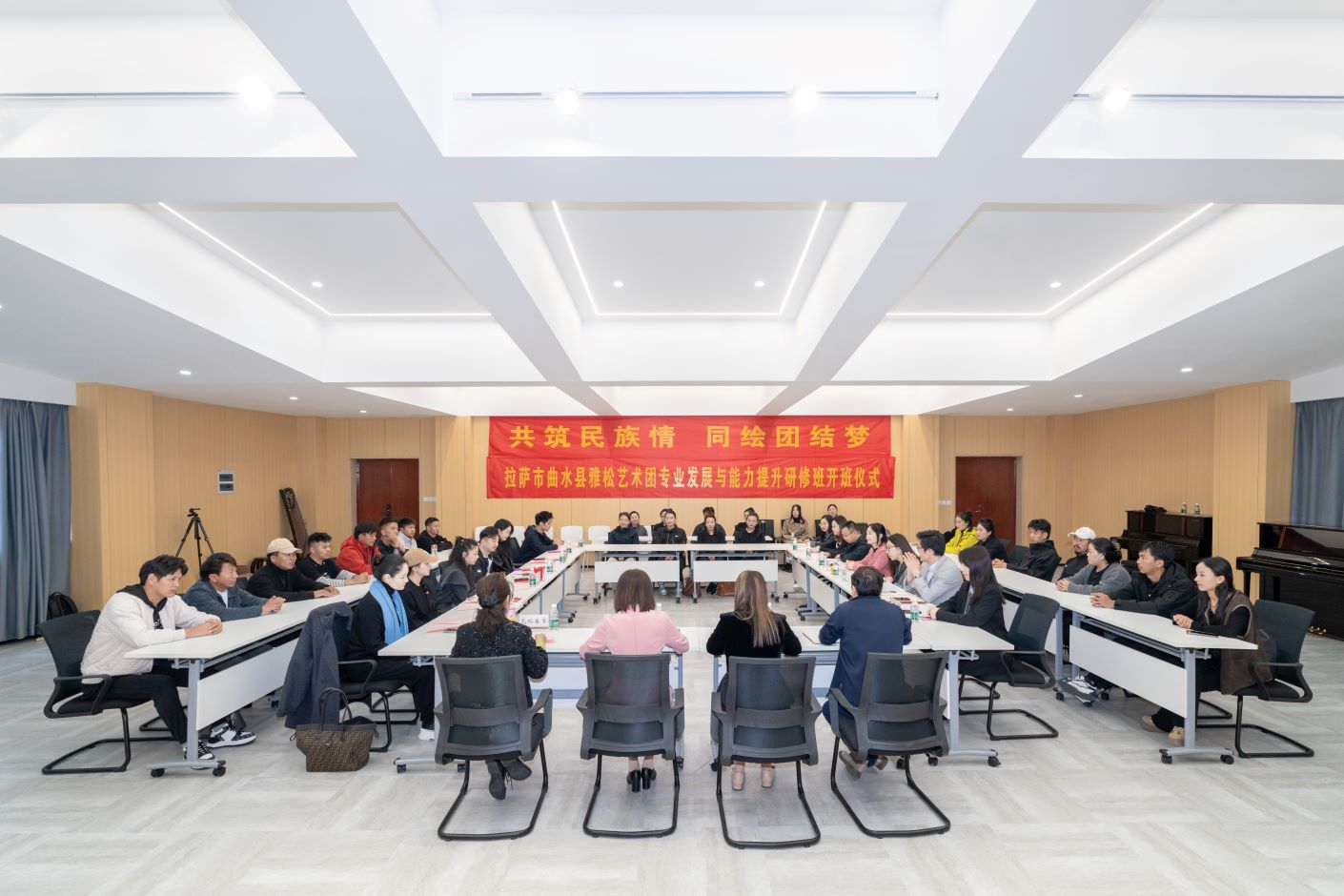 开班式结束后,雅松艺术团在音乐学院舞蹈房进行专业展示汇报,表演了《扎西雪巴》《格桑央恰》《喜马拉雅的雪》《欢迎你到曲水来》等歌舞作品。随后,授课教师根据专业汇报情况开展集体研讨,进一步完善课程安排,提高研修指导的针对性地和专业性。