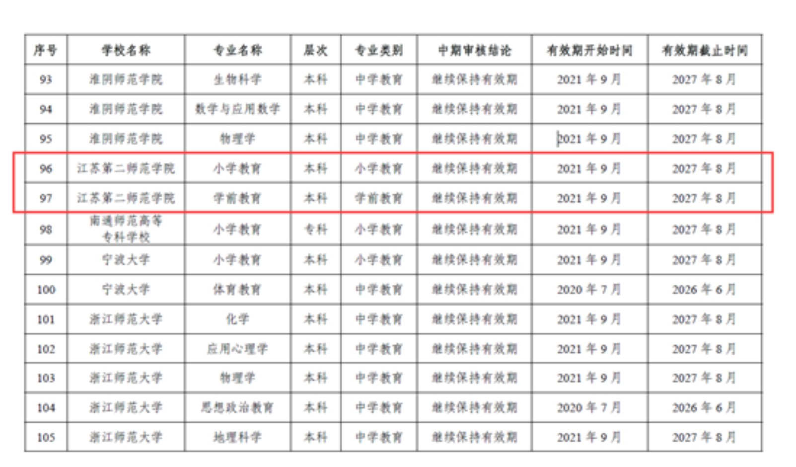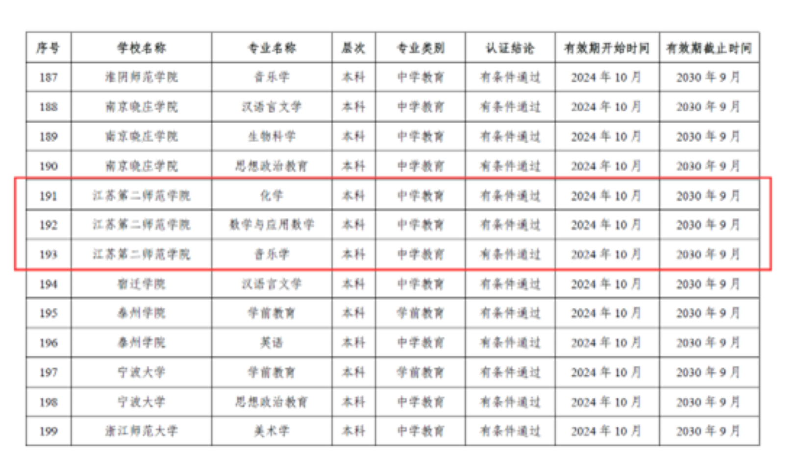 近日,教育部办公厅发布《关于公布2024年通过普通高等学校师范类专业认证及认证中期审核专业名单的通知》(教师厅函〔2024〕20号),我校数学与应用数学、音乐学和化学3个专业顺利通过教育部普通高等学校师范类专业第二级认证,认证结论有效期六年,自2024年10月起至2030年9月止。我校学前教育和小学教育专业顺利通过了师范类专业认证中期审核,继续保持原认证有效期。