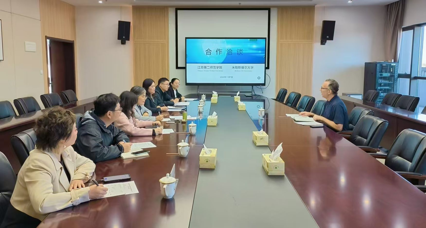 会上,赵玉蓉代表学校对美国米勒斯维尔大学代表的到来表示热烈欢迎,并详细介绍了我校发展历程、办学特色以及国际合作交流情况。双方就目前正在开展的1+2+1商务英语联合培养项目合作情况进行了交流,并探讨了其他合作的可能性。
