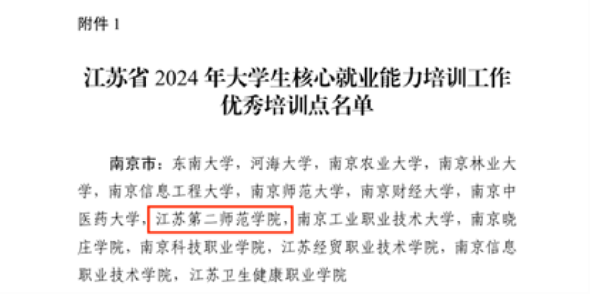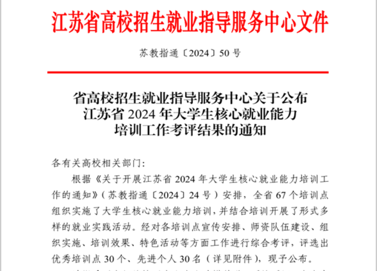 近日,江苏省高校招生就业指导服务中心公布了2024 年大学生核心就业能力培训工作考核结果,我校被评为“优秀培训点”,招生就业处副处长李佶莲荣获“先进个人”称号。