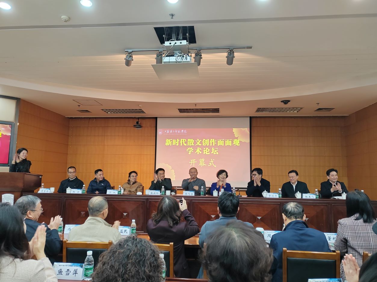 梅景辉副校长在致辞中引用马克思的经典名句,谈到哲学是时代精神的精华。他认为,哲学是以理性的思维方式来反映时代精神,如果要以感性方式来呈现,必然离不开文学。每个时代有每个时代的精神映射,每个时代有它自己的文化和文学。各种文学体裁中,散文具备特有的内倾性、治愈性和广泛性特点,能够传递一个民族立体的精神风貌。散文作品最能够融入我们的生活世界,好的散文作品能够反映我们的文化传统,能够映射我们的社会规范,还能够映射作者和我们读者的内在心灵和个性,这就是散文具有广泛的共识性的原因所在。他期待大家共同探讨新时代散文创作和哲学、美学、社会学、人类学等多学科的融合发展创新,必然会将江苏打造成为习近平文化思想的实践高地。