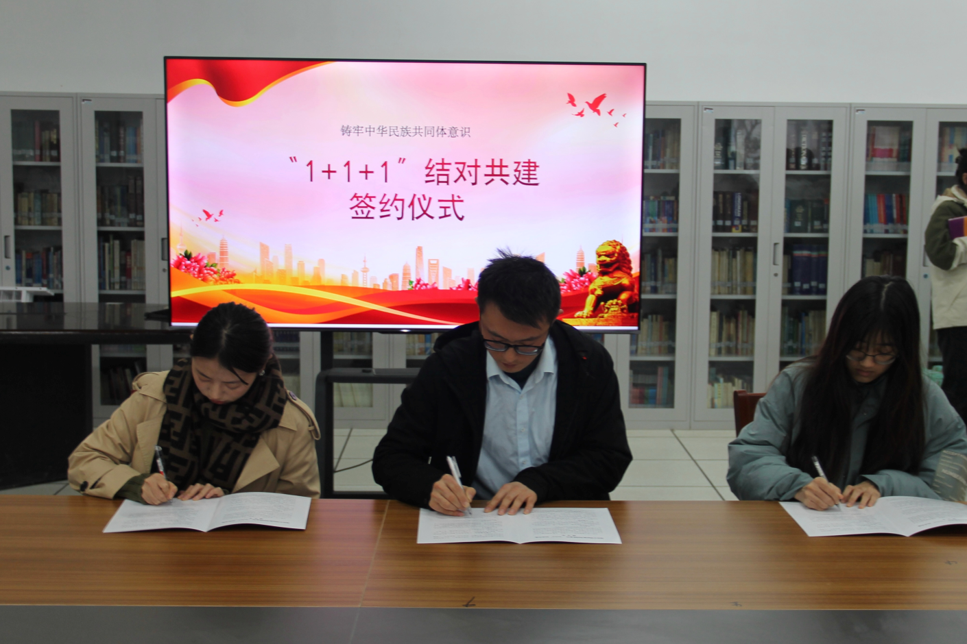 在“1+1+1”结对共建签约仪式现场,党员、入党积极分子和少数民族学生分别签署了铸牢中华民族共同体意识结对共建协议书。学生党支部以结对共建为纽带,发挥党员先锋模范作用,建立与少数民族学生的常态化沟通桥梁,助力解决少数民族学生在学习、生活、就业中遇到的困难,推动各民族同学交往、交流、交融。