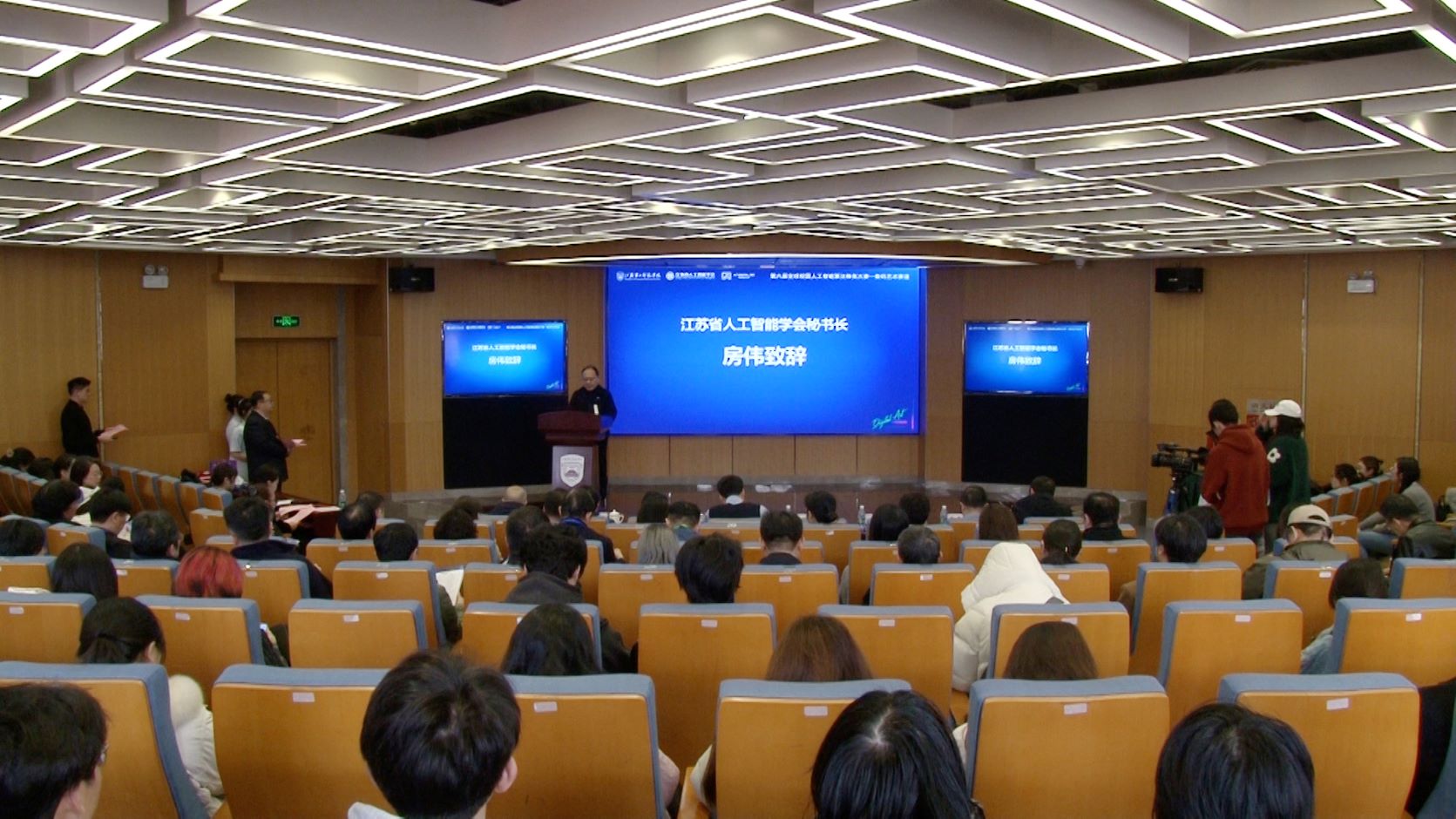 江苏省人工智能学会秘书长房伟在大会致辞。他表示,全球校园人工智能算法精英大赛聚焦“人工智能+X”知识体系下的人才能力培养,为加快人工智能算法创新人才培育、提升学生高质量创业就业探索出一条新途径。数码艺术赛道作为今年大赛新设的赛道,希望激励高校学子利用人工智能技术进行数字艺术创作的热情,积极探索人工智能与艺术的融合创新。