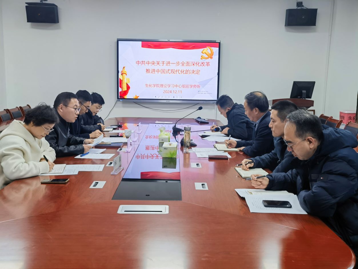 12月11日上午,生化学院党总支理论学习中心组在M1-335举办了理论学习会,会议由生化学院党总支书记朱学伸主持,学习主题内容为《中共中央关于进一步全面深化改革 推进中国式现代化的决定》(以下简称《决定》),校巡学旁听工作组组长皇甫立同及工作组成员出席会议。
